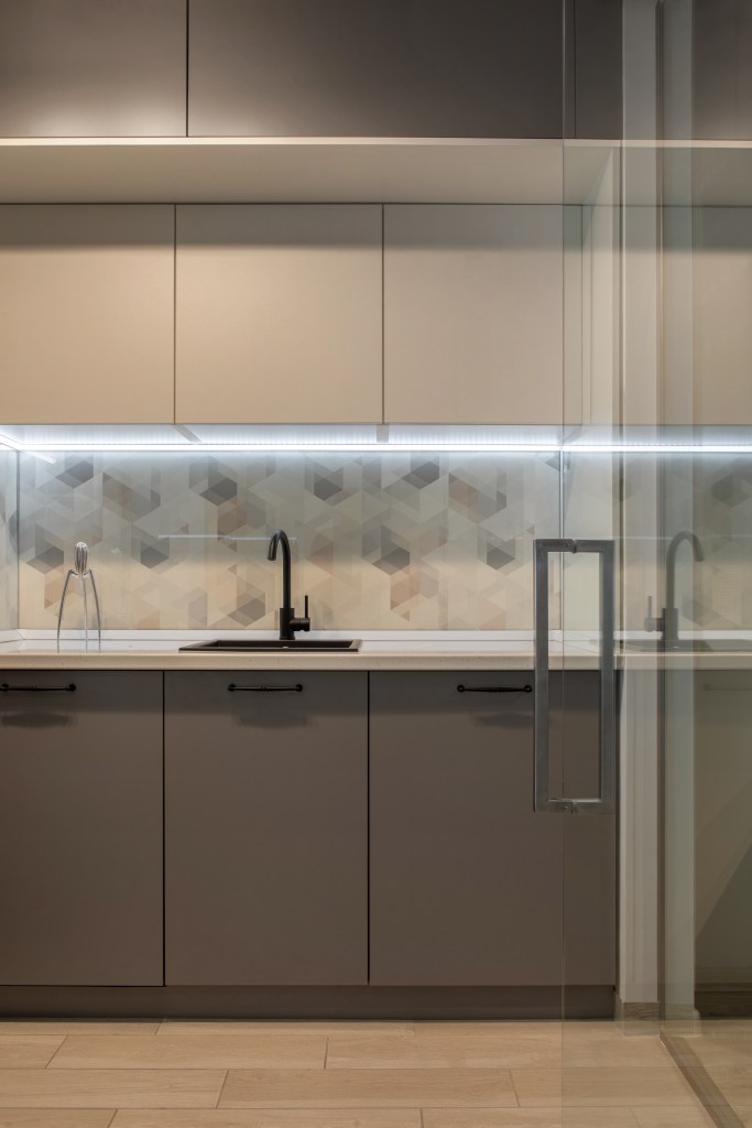 Peretele din sticlă care separă bucătăria de living este cel mai spectaculos element din proiectul semnat de designerul Cristina Cătălina Ciobanu. Întreaga amenajare este gândită în ideea de echilibru între partea de design și funcționalitate a spațiului. Apartamentul cu două camere, situat în zona Nerva Traian din Capitală, urmează să fie închiriat prin Airbnb și a fost amenajat cu un buget de 15.000 euro.