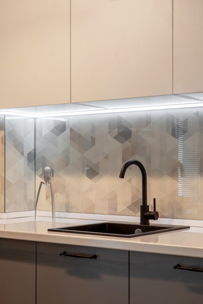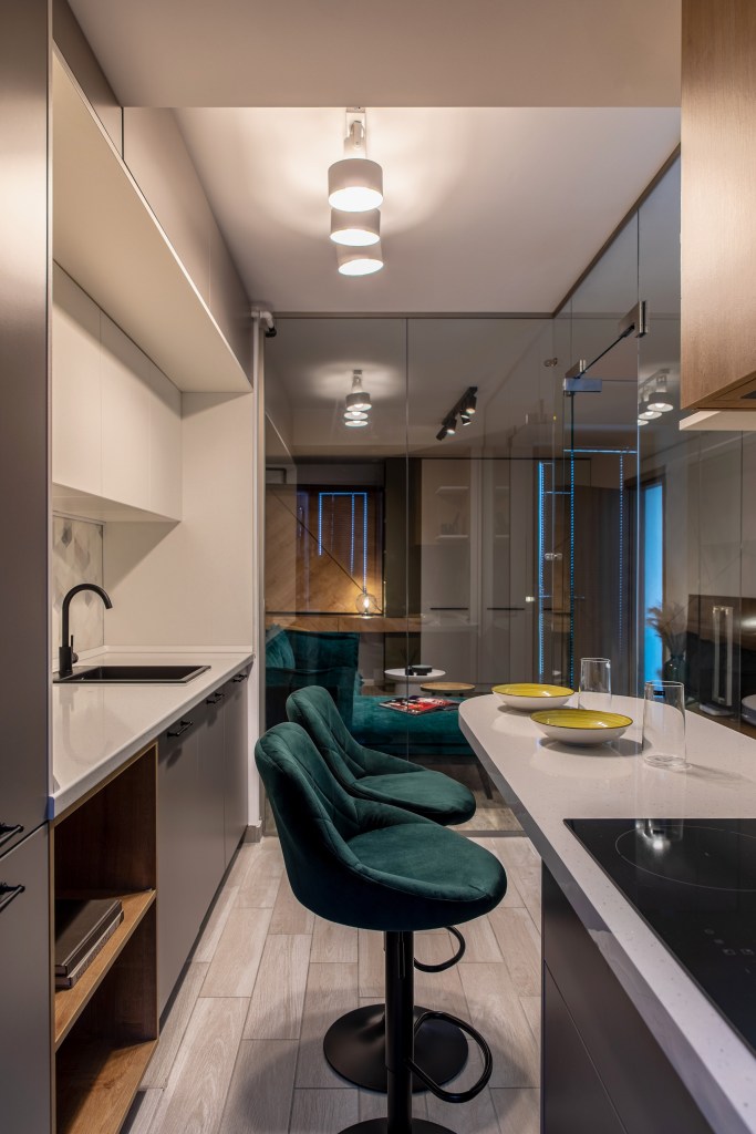 Apartamentul are două camere și o suprafață de 53 metri pătrați. Cel mai important lucru pentru Cristina a fost să obțină un interior aerisit și practic, fără să sacrifice componenta estetică. Mobilierul este făcut pe comandă, aproape în toată casa, pentru a se mula cât mai bine pe arhitectura spațiului. Bucătăria, cu o suprafață nu foarte generoasă, este un exemplu de organizare eficientă. Dulapurile înalte până în tavan asigură tot necesarul de depozitare, iar insula tip bar în care este integrată și o plită cu inducție, preia și rolul de masă de dining. Zona de contrablat este personalizată cu tapet cu model geometric, peste care a fost aplicată sticlă clară, un truc folosit de Cristina pentru a ține bugetul sub control.
