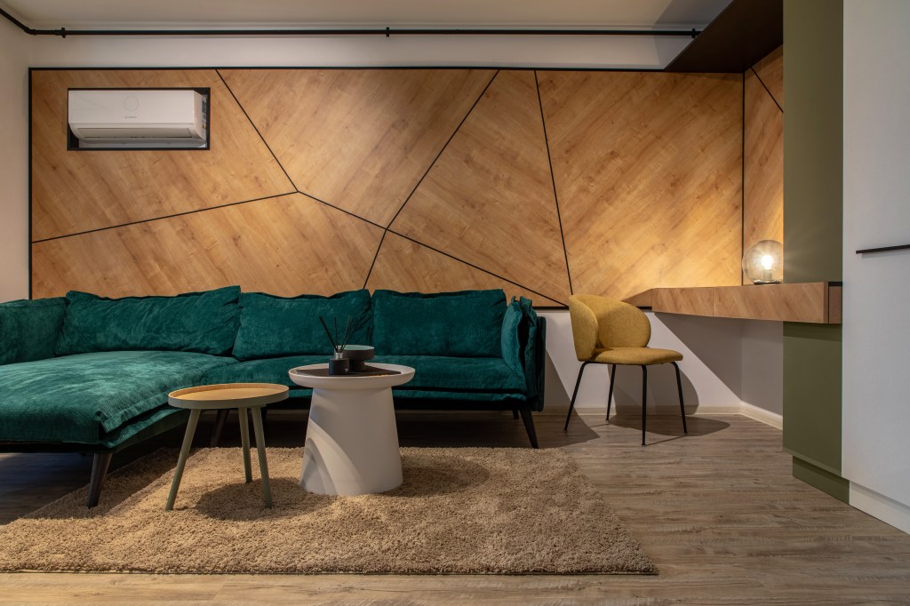 Pereții de sticlă care separă livingul de bucătărie favorizează pătrunderea luminii naturale în interior. Livingul a căpătat căldură și prin texturile și finisajele folosite în amenajare. Ca să obțină un element de focus, Cristina a placat peretele din dreptul canapelei cu pal melaminat de la Egger. Fladerul a fost poziționat în unghiuri diferite pentru a crea un model cu personalitate, lucru accentuat și de baghetele decorative negre, așezate în diverse forme geometrice. Cristina a compartimentat încăperea în zone cu funcțiuni diferite. Astfel, a obținut o zonă de lounge, cu o canapea confortabilă sub formă de „L”, zona media și un mic birou, poziționat în prelungirea dressingului. Scaunele de bar din bucătărie împrumută verdele colțarului pentru coerență vizuală.