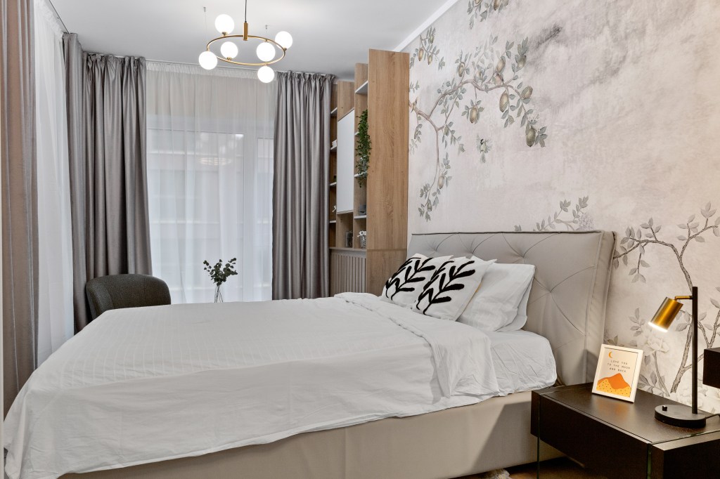 Și dormitorul a fost un spațiu dificil de amenajat, încăperea având aceeași formă ciudată ca livingul. Pentru echilibru vizual, dar și din considerente practice, Alexandra a ales să compartimenteze camera în două zone diferite: una pentru odihnă, alta pentru depozitare. Ca elemente de continuitate, a ales tapetul, texturile catifelate și nuanțele neutre. Avantajul acestei încăperi este colțul vitrat prin care pătrunde o cantitate mare de lumină naturală.