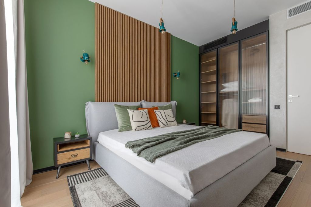 În dormitorul matrimonial regăsim aceeași nuanță de verde folosită la mobilierul de bucătărie, iar pe tavan același accent de vopsea decorativă folosit pe plafonul din living. Acesta reprezintă, de altfel, un detaliu important în crearea unui decor cu note industriale.