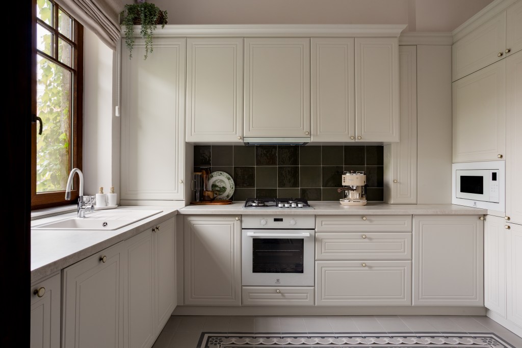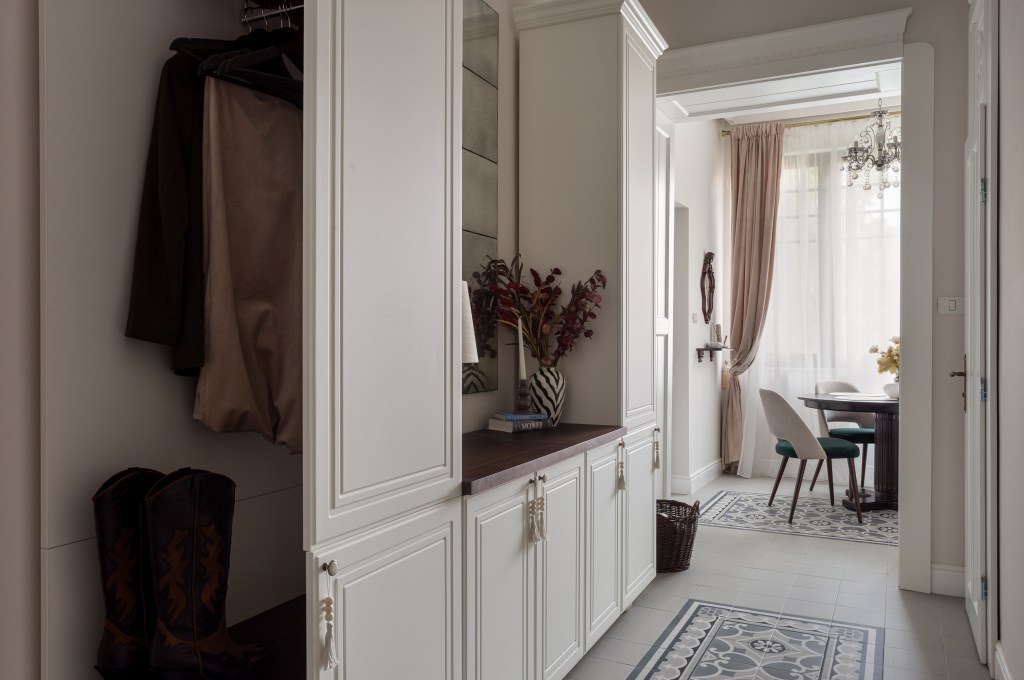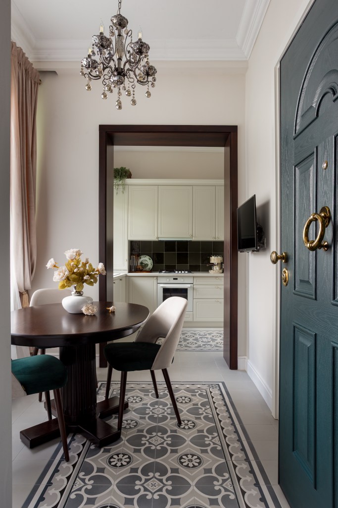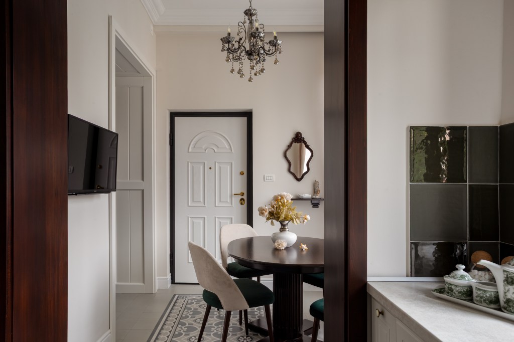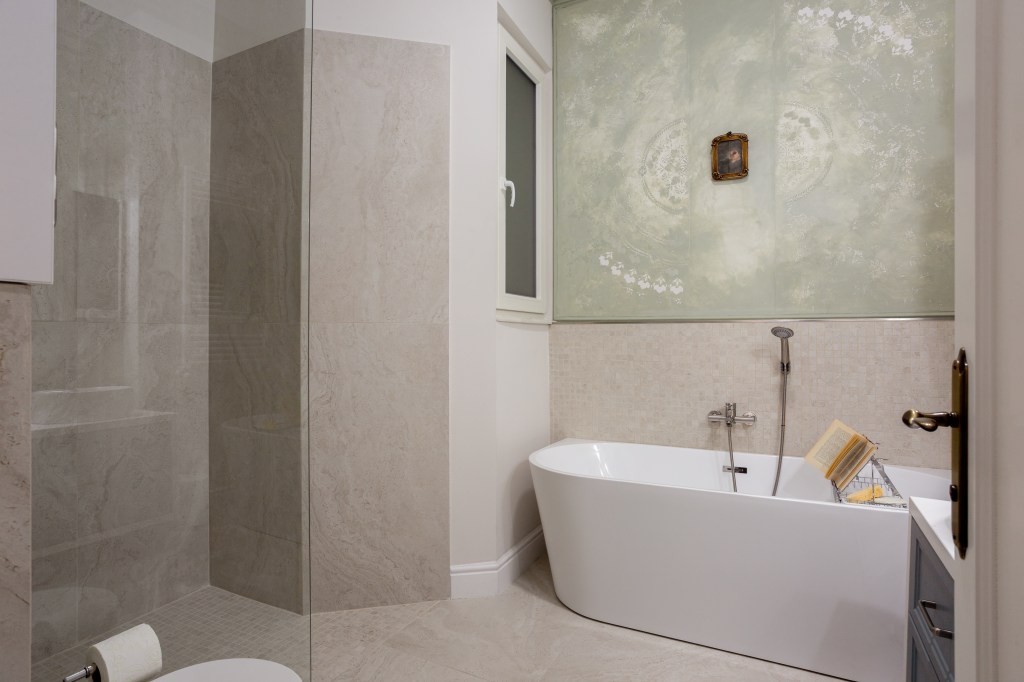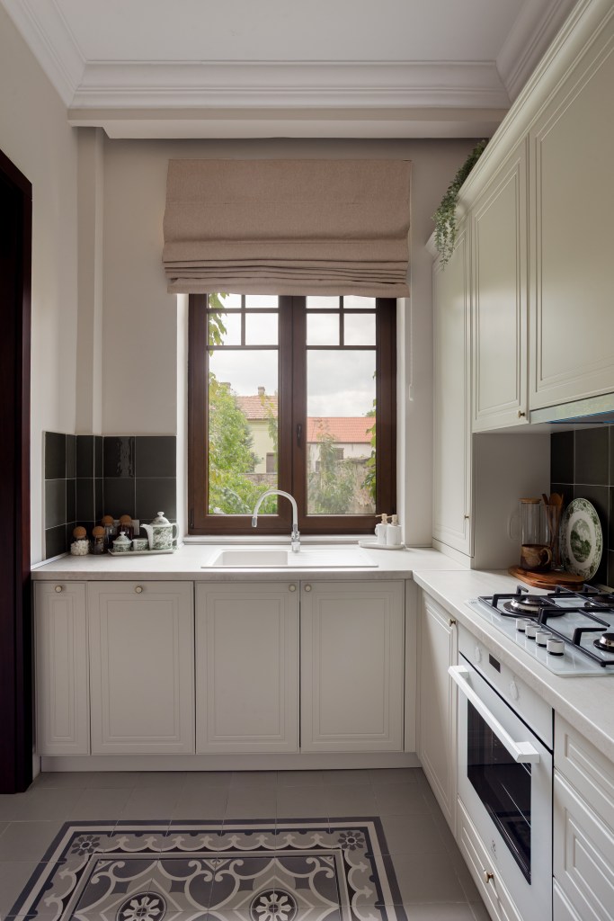 Instalațiile sanitare și electrice au fost complet înlocuite, pentru a se adapta noului concept de design. Spațiul a devenit de nerecunoscut după aplicarea finisajelor. Raluca s-a folosit de plăcuțe de ceramică pentru a crea covorașe în bucătărie și în hol, dar și pentru a evidenția zona de duș și cadă, unde a combinat mozaic și plăci medii de ceramică. A integrat mai multe tipuri de tapet, tencuieli speciale și profile decorative pentru a obține un aer clasic care să rezoneze cu istoria clădirii.