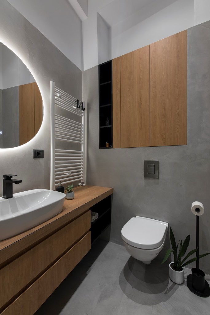 „Băile nu au fost deloc pe placul proprietarilor”, povestește arhitectul Alexandru Bucur. „Am propus acoperirea placărilor cu un strat de microciment pentru un aspect modern. A fost o etapă care ne-a dat mici bătăi de cap. Dar a fost o soluție care ne-a ajutat să ținem bugetul sub control și să nu complicăm mai mult șantierul”.