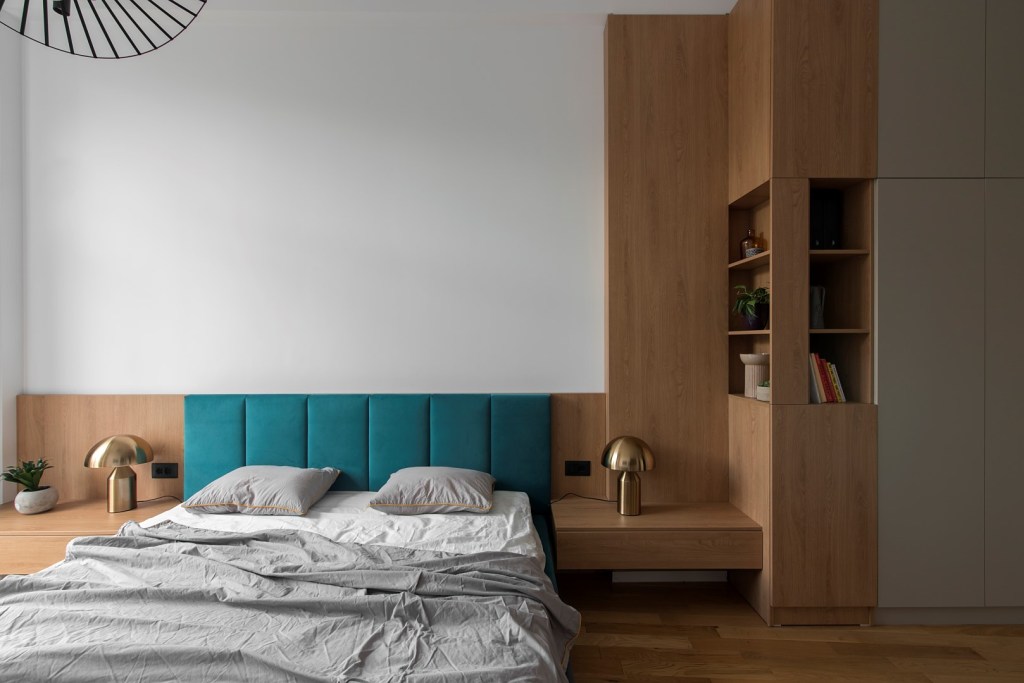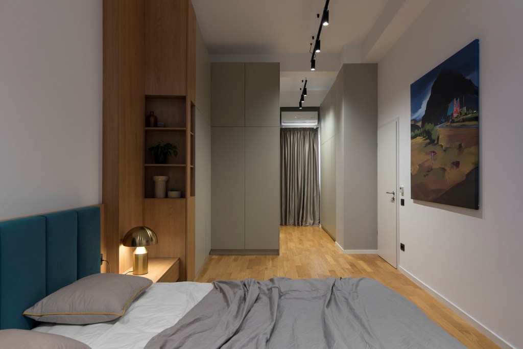 Și în dormitorul matrimonial, proiectarea dressingului s-a dorit a fi cât mai subtilă și mai eficientă. Încăperea are o suprafață generoasă de 21 metri pătrați. Patul este așezat mai spre fereastră în ideea de a lăsa liberă zona de mijloc pentru exercițiile de yoga.