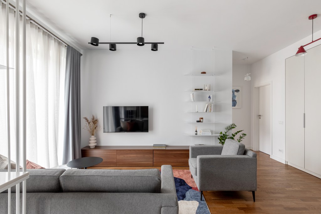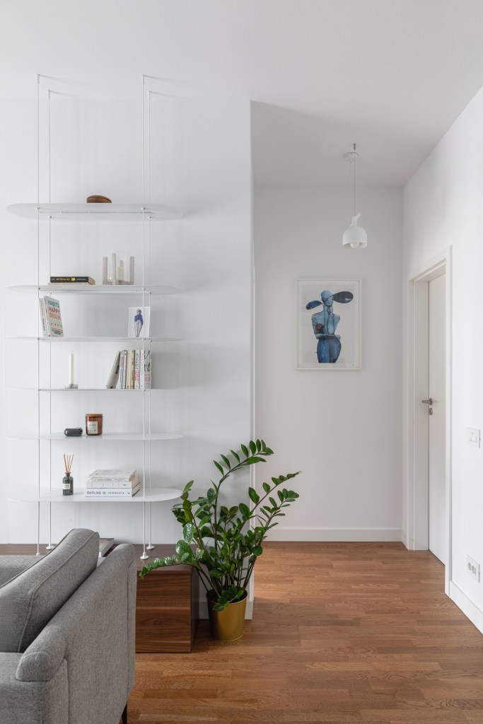 Pentru că apartamentul nu are hol la intrare, Alina a avut grijă să compenseze absența prin crearea unei niște în dulapul din living, necesară pentru hainele de exterior și păstrarea de diverse lucruri. Într-una din secțiuni este și o zonă așa zis tehnică, ce găzduiește mașina de spălat rufe, uscătorul și alte elemente necesare pentru curățenie. Foarte mult a contat înălțimea generoasă a apartamentului, de 2,85 metri, pentru că a permis exploatarea pe verticală a spațiului. Tot mobilierul folosit în proiect este înalt până în tavan, lucru care a dus la suplimentarea depozitărilor.