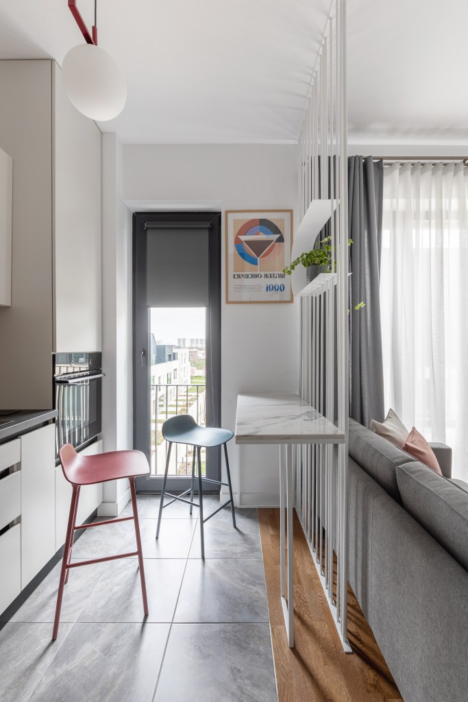 Pentru a delimita livingul de bucătărie a optat pentru o construcție din tije subțiri, vopsite alb, pentru a nu încărca spațiul cu materiale masive. Și a mai montat un ansamblu de blat cu înălțimea de 90 centimetri, proiectat de ea și executat de Woovi Studio. Blatul din marmură e făcut pe comandă.