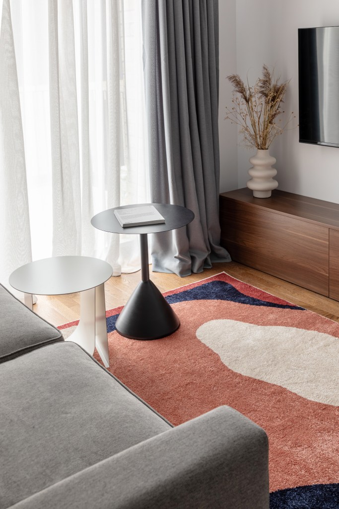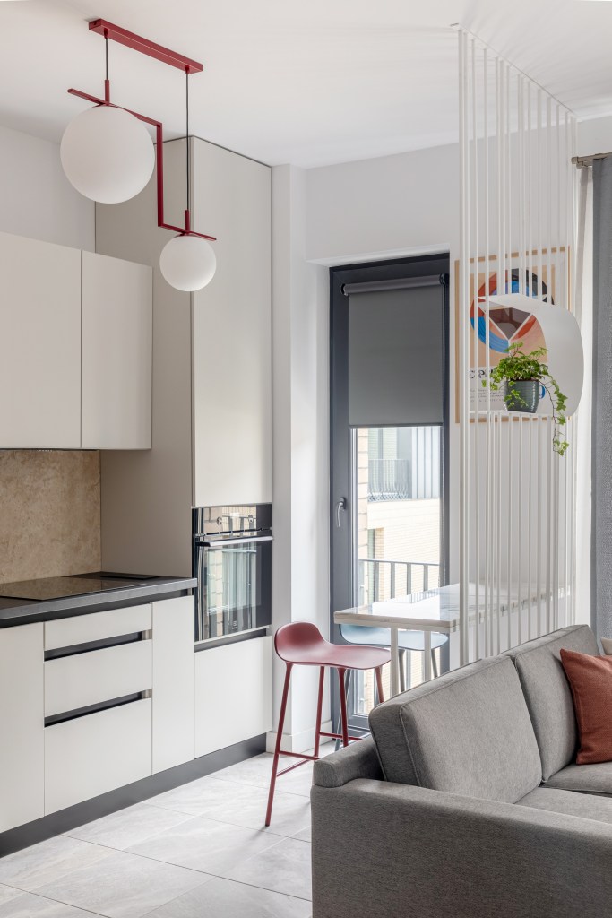 „Amenajarea studioului este una contemporană, cu elemente scandinave și detalii fine din stilul industrial”, spune Alina. „Am încercat să maximizez funcționalitatea într-un spațiu redus și să creez armonie între interior și exterior, lucru realizat prin materialele și cromatica utilizate (metal, piatră, nuanțe de alb, gri, bej, prezente în complexul în care e situat imobilul). Pentru a integra și spiritul ludic am mixat nuanțe de roșu și albastru în câteva dintre obiectele de mobilier de serie, iluminat și decorațiuni”.