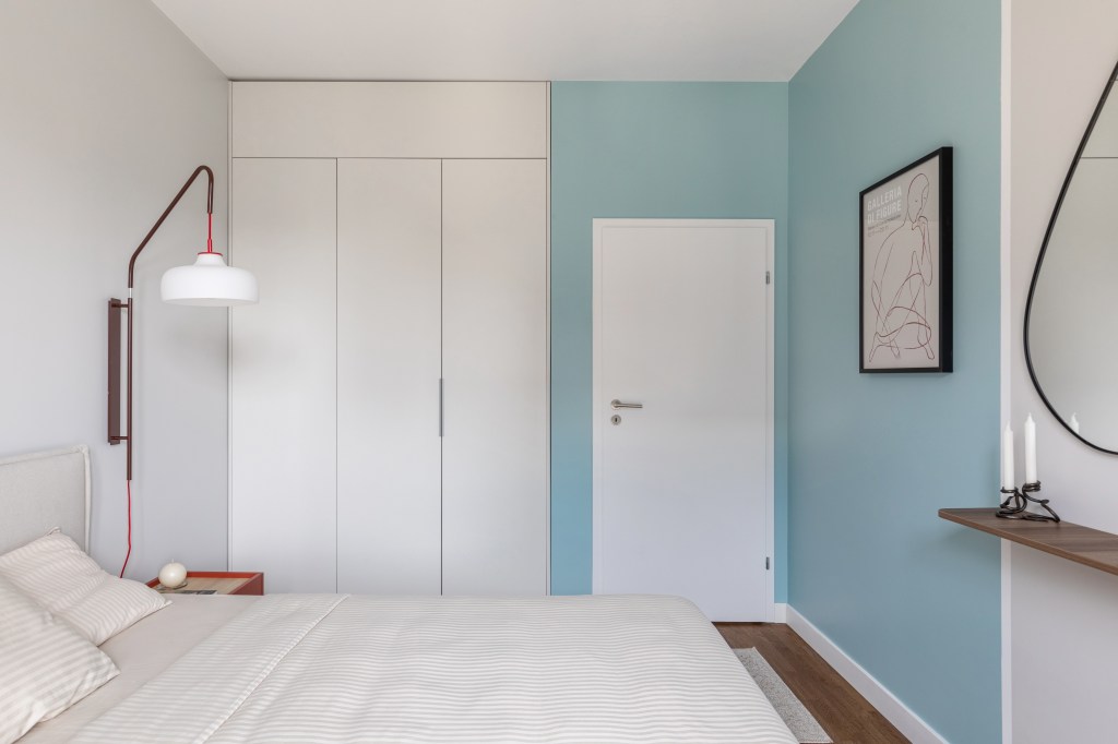 În dormitor, spațiul este aerisit și liber. Există și aici un walk-in dressing bine compartimentat, dispus pe toată înălțimea peretelui. Practic, o zonă de 2,2 metri pătrați din dreapta ușii e închisă cu mobilier, obținându-se astfel o depozitare generoasă, dar foarte discretă. Pereții sunt decorați cu vopseaua lavabilă de la Benjamin Moore în două culori, grej și albastru.