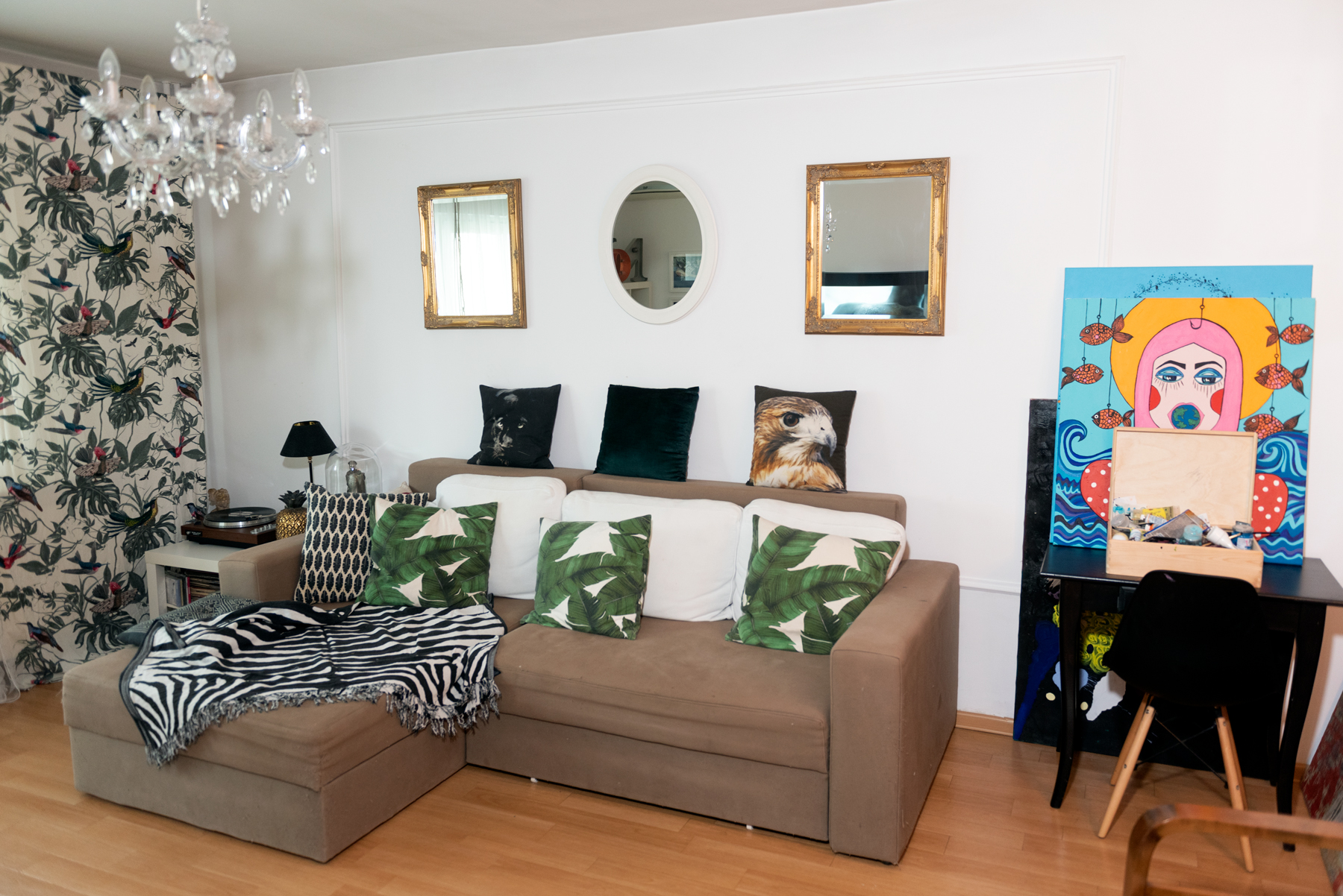 Pentru că ambii au o colecție generoasă de haine, Diana a improvizat un dressing imens în dormitor, acoperit de niște perdele cu motive tropicale. Tot în dormitor a făcut loc și colecțiilor de ochelari și genți. Crede în moda sustenabilă, iar atunci când adună prea multe haine organizează resale-uri, împreună cu partenera ei de proiect, Alina Tanasă.