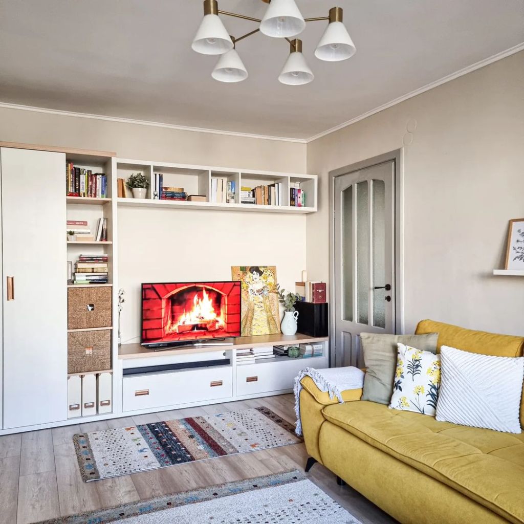 „Livingul a fost un spațiu dificil de amenajat, fiind o încăpere folosită ca zonă de zi, dar și ca dormitor al nostru. Ne-am străduit să-l amenajăm isteț și practic. Am încercat să nu exagerez cu zonele de depozitare ca să nu aglomerez vizual încăperea. Canapeaua galben muștar este piesa mea preferată de aici. Cred că este cel mai scump obiect din casă, dar își merită pe deplin toți banii”, spune Krisztina.