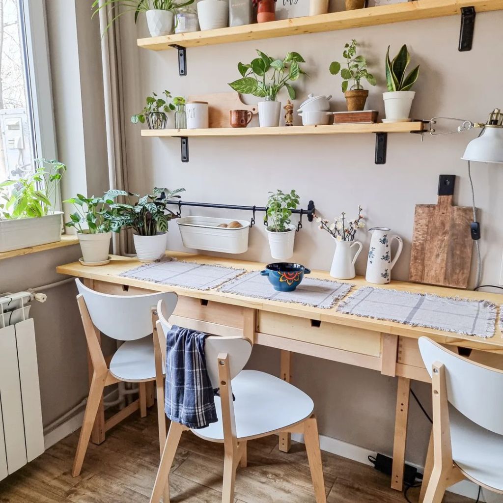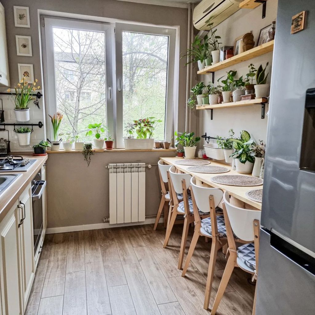 Și în bucătărie a fost nevoie de ingeniozitate pentru organizarea spațiului. Fiind o încăpere îngustă, a fost imposibilă amenajarea unei zone obișnuite de dining. Soluția a fost o mesă îngustă, poziționată de-a lungul peretelui, în jurul căreia să se adune întreaga familie. Mobilierul este unul clasic, de la Ikea. Deasupra mesei au montat rafturi deschise unde au așezat mici obiecte de decor și zeci de plante care transformă camera într-o mini junglă. Deși nu este foarte spațioasă, bucătăria compensează prin decor și lumină naturală.