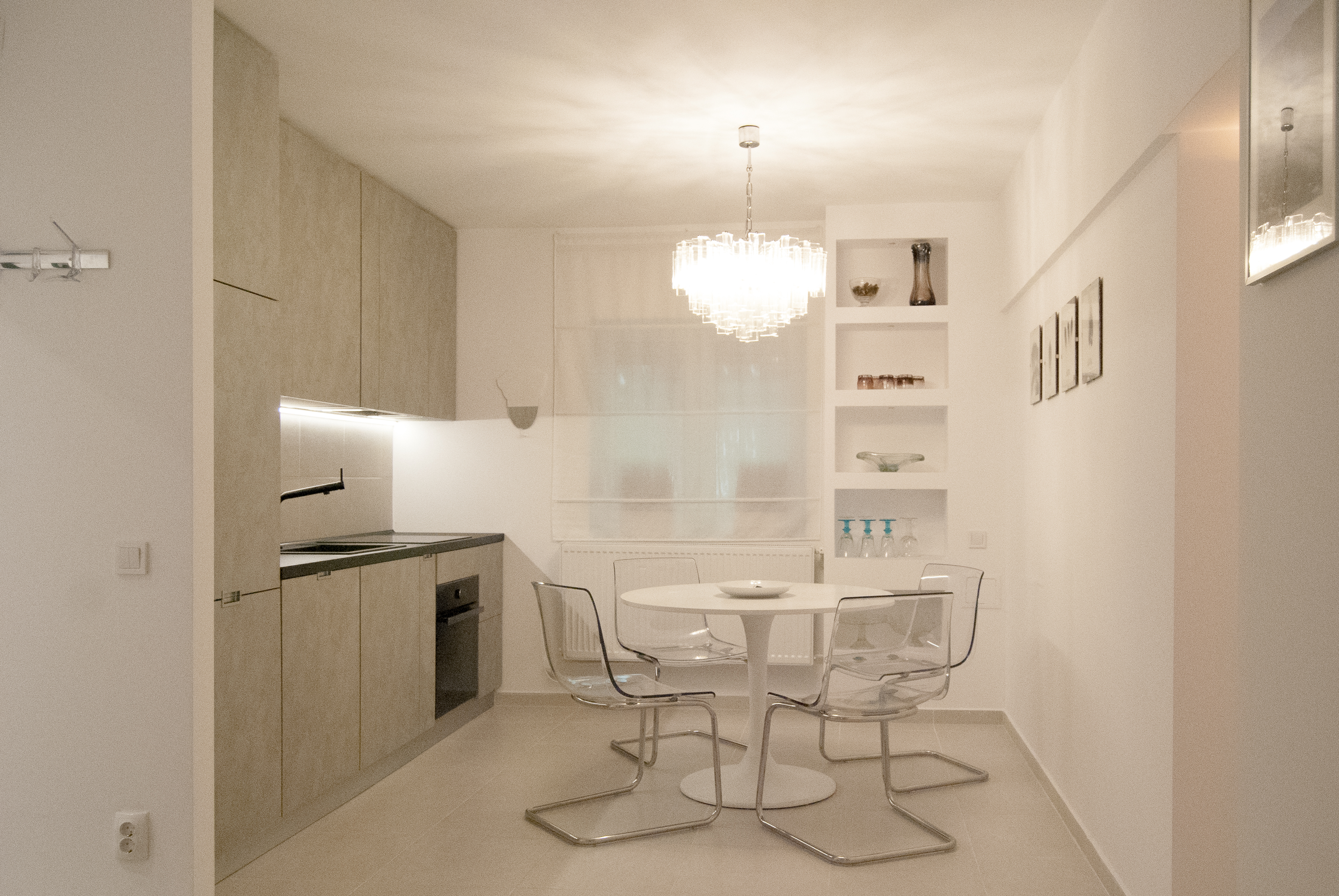 Aglomeraţia inițială, cauzată de obiectele depozitate la vedere, a dispărut pentru a lăsa loc unui stil minimalist, dominat de alb şi linii simple. Proprietarii apartamentului de 67 metri pătrați cu trei camere, deşi aflați la vârsta pensionării, au gusturi moderne. Au preferat o amenajare aerisită cu accente deosebite, adăugate prin pete saturate de culoare și piese de mobilier inedite. Iar cel mai inedit element? Un set de fotolii avangardiste în living.