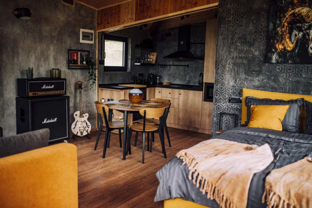 Cabana are o suprafață utilă de 40 metri pătrați și o suprafață desfășurată de 60 metri pătrați. Cuprinde un living cu bucătărie open space, o baie cu duș walk-in, o canapea extensibilă și un pat king-size. Ferestrele imense măresc vizual spațiul și creează o punte cu natura și peisajul din jurul cabanei.