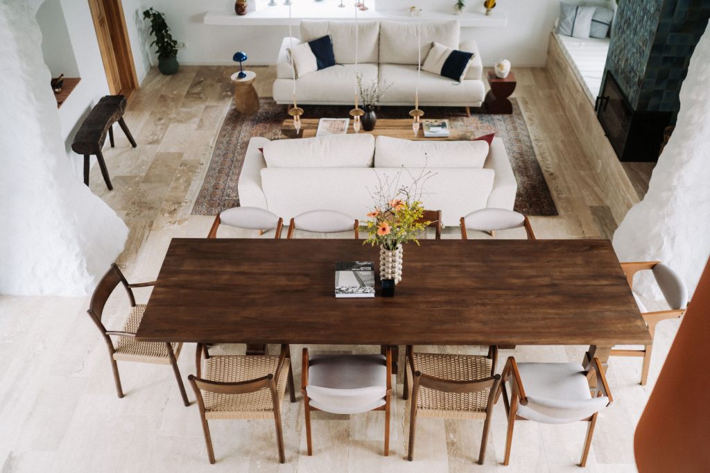 „Am avut încredere în viziunea lui Bogdan. Am mai colaborat în trecut și știam că avem gusturi similare”, spune Adriana. „Mi-am dorit să integrăm cât mai multe obiecte vechi, cu poveste, dar să le punem într-un context actual. Am folosit multe materiale naturale precum lemnul sau piatra și am mizat pe texturi care să adauge căldură. Casa este și foarte luminoasă, și asta ne-a ajutat mult”.