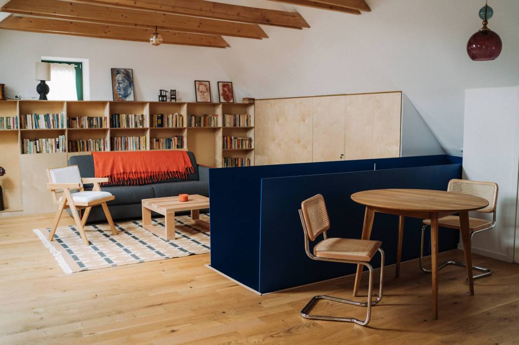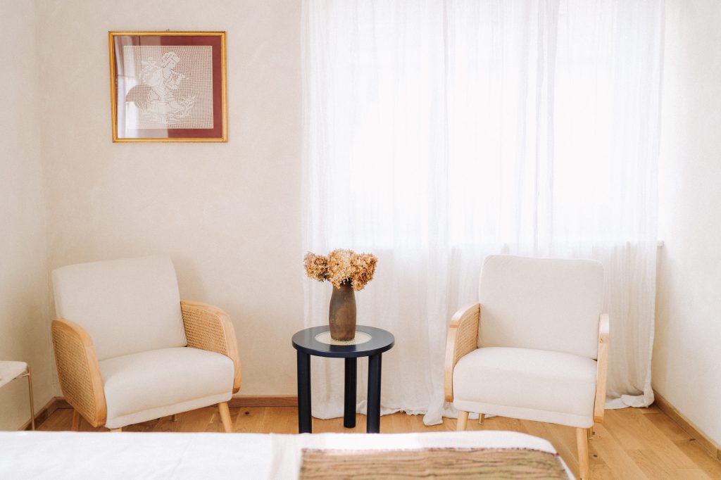 La fel ca la Casa Domestic, amenajarea interiorului a contat mult. Adriana, care este pasionată de zona aceasta de design, a colaborat cu arhitectul Bogdan Costea pentru a contura un interior care să reia ideea arhitecturii, adică favorizarea dialogului dintre nou și vechi. Au ales tot din casa de oaspeți Porumbacu 134, de la paletă cromatică neutră, texturi, decorațiuni sau corpuri de iluminat, pentru a da sentimentul de spațiu cald și primitor. Interiorul este gândit prin prisma celor care o să treacă pragul casei și nu urmărește neapărat perfecțiunea estetică, ci crearea unei relații cu cei care poposesc aici.