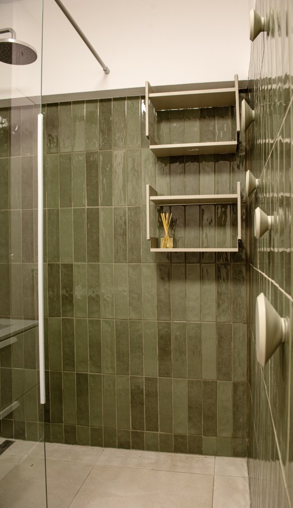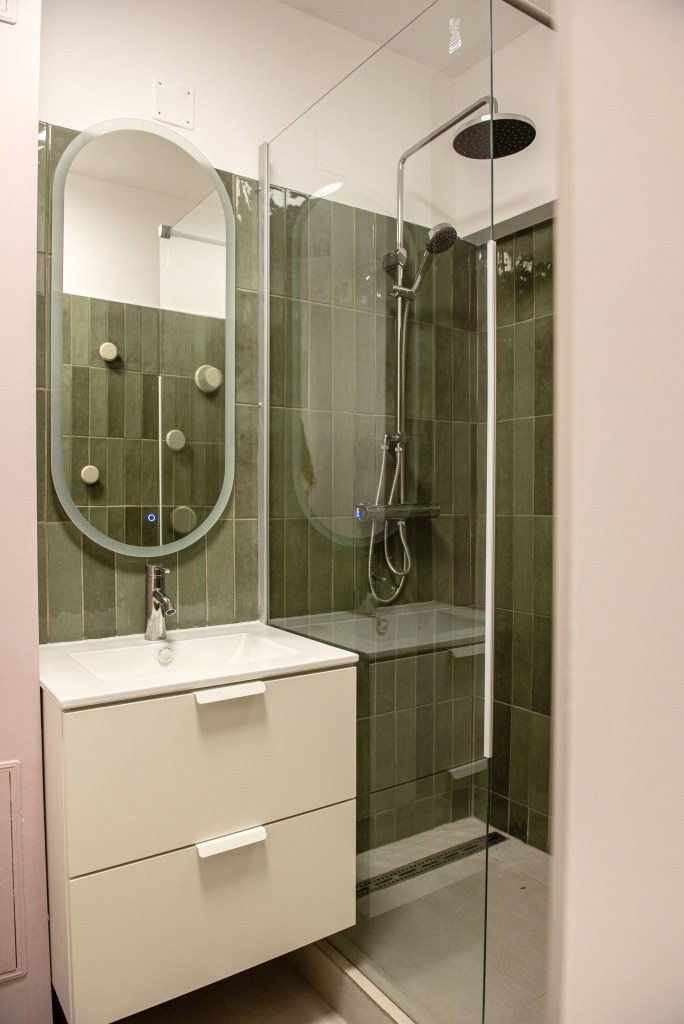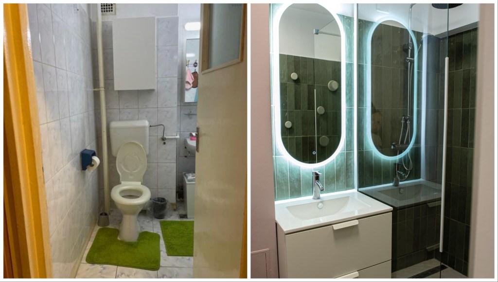 „Nu am neglijat funcționalitatea spațiului, chiar dacă vorbim de o încăpere de mici dimensiuni, am încercat să includ suficiente soluții de depozitare. Din punct de vedere cromatic, baia merge pe o combinație jucăușă de verde, gri și roz”, spune Adina.