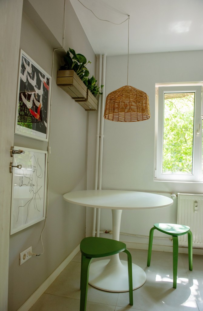 Balconul, folosit înainte ca spațiu de depozitare a devenit, în urma reamenajării, colțișor de lectură. Încăperea este mobilată cu strictul necesar: un fotoliu și o etajeră minimalistă. Interesant este, însă, tavanul verde salvie și luminițele care îl decorează. Verdele este prezent și în hol, fiind pata de culoare care dă viață unui spațiu, mai degrabă, funcțional. Este o zonă dedicată, în primul rând, depozitărilor. Ca element decorativ, Alina a optat pentru o oglindă ovală, cu ramă metalică și un cuier cu design jucăuș, de la The Home.