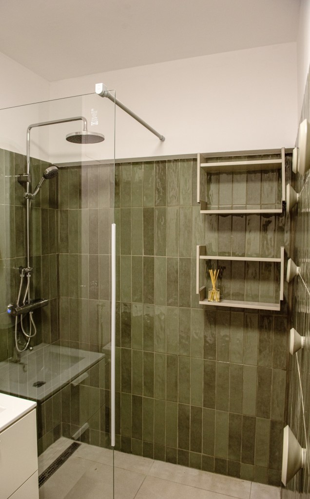 Baia este spațiul care a avut nevoie cel mai mult de lucru ca să continuie tematica generală a amenajării. Pe lângă culori și detalii schimbate, a dispărut și cada grea din fontă, pe care a înlocuit-o cu un duș walk-in, cu paravan de sticlă.
