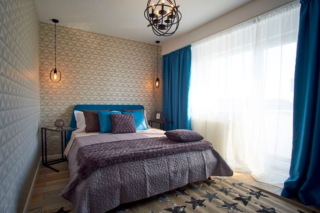 În dormitorul principal, Georgiana a adus iarna, prin culori reci și textile călduroase. A pus mobilier doar pentru strictul necesar, ca să lase spațiul liber. În contrast cu patul tapițat, ce dă confort și căldură, se află noptierele și aplicele metalice, cu aer industrial. La capitolul finisaje, tapetul cu motive geometrice aduce un plus de dinamism spațiului.