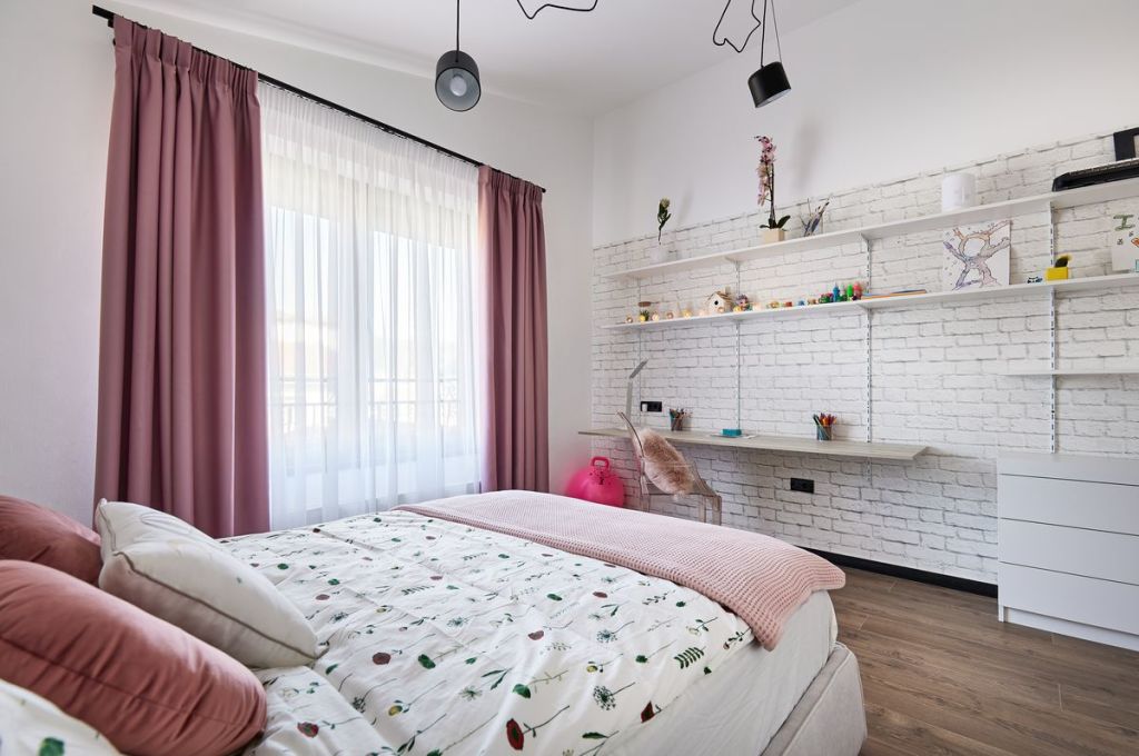 Anca a gândit camera fetiței pentru un cumul de activități, căci cea mică are diverse pasiuni: de la fotografie, la modelare în plastilină și desen. Iată de ce a accesorizat un întreg perete cu rafturi și polițe multiple, cumpărate de la IKEA. Influențele industriale nu lipsesc nici din această cameră, dovadă fiind corpul de iluminat tip reflector suspendat, de la Extralighting, și tapetul cu textură de cărămidă albă de la Zen Interior. Acest tapet este mixat cu unul floral folosit pe peretele cu patul, ce îi dă un aer feminin amenajării.