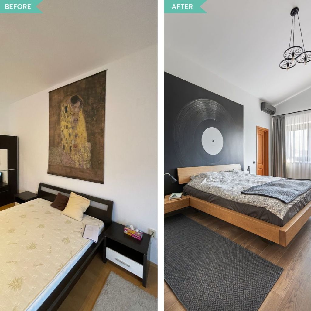 Dormitorul matrimonial reflectă pasiunea pentru muzică a proprietarului. Astfel, peretele din spatele patului este decorat cu un autocolant ce sugerează o placă de vinil. Finisajul este cu atât mai sugestiv cu cât este în deplin contrast cromatic cu restul amenajării. Mobilierul folosit este strictul necesar, mai exact un ansamblu format din pat și două noptiere, din lemn masiv. Dormitorul se continuă firesc cu un dressing și o baie proprii.