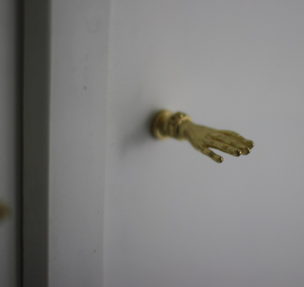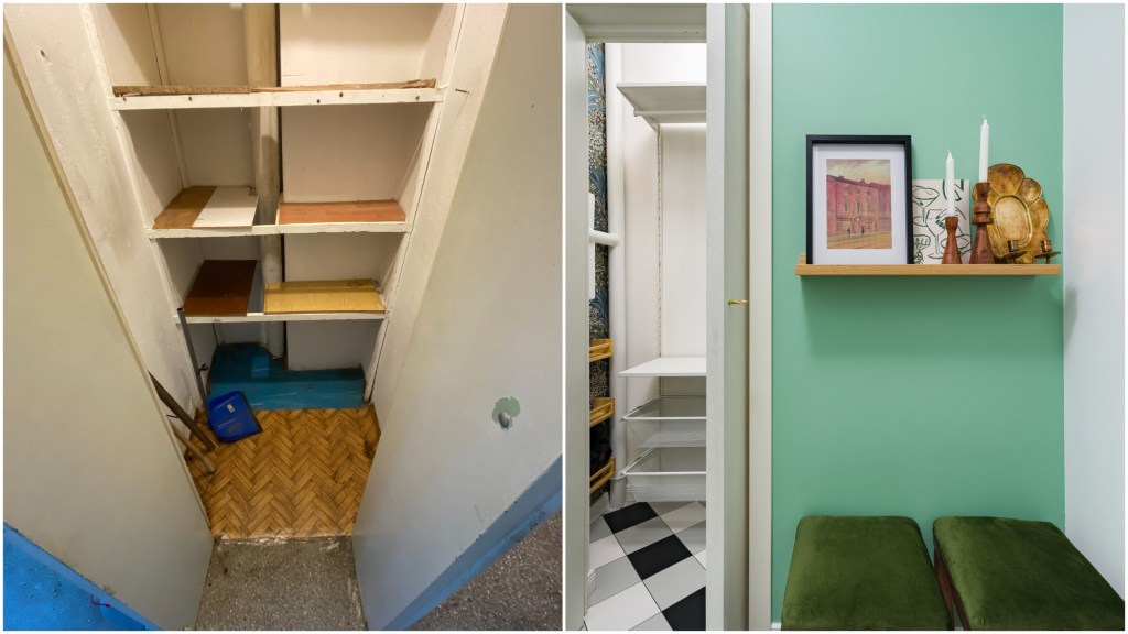 Ca să echilibreze bugetul, Anda a optat, în general, pentru finisaje și obiecte din magazinele retail. Mobilierul este, în mare parte, de la Ikea: bucătăria, canapeaua, spațiile de depozitare. A mai păstrat și câteva obiecte din fosta amenajare, chiar dacă era vorba de piese care nu aveau neapărat valoare sentimentală. „În holul de intrare, am refolosit un abajur din sticlă al unei lustre pe care l-am transformat în aplică de perete. Tot în holul de intrare am păstrat doi tabureți pe care am încercat să îi restaurăm și chiar să păstram toate straturile originale, cum ar fi umplutura cu paie. Nu ne-a luat decât două luni de lucru pentru un rezultat puțin cam îndoielnic, aș zice” glumește Anda. Tot în hol, arhitecta a păstrat ușile originale a două debarale, pe care le-a vopsit și cărora le-a adăugat mânere atipice. În interior a pus tapet și a continuat jocul plăcilor de gresie din hol.