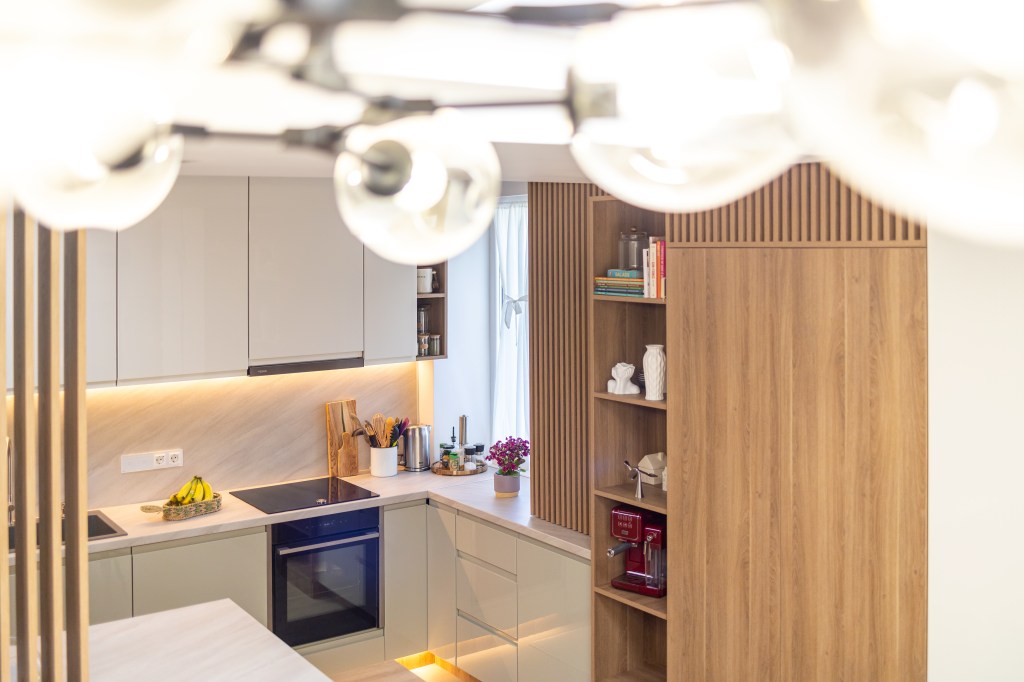 Proiectul a presupus modificarea planimetriei apartamentului. Ioana a spart peretele care separa bucătăria de living, din care a păstrat un decupaj: a creat culoar direct între cele două încăperi, dar a și spațiu pentru televizor. Insula din bucătărie continuă în living cu o masă de dining, o adiție necesară într-o locuință de familie cu doi copii. Proprietarii și-au dorit de la bun început zone dedicate timpului cu familia, iar Ioana s-a asigurat nu doar că le creează, dar că le face ușor de îngrijit. Pentru mobilier, a ales materiale ușor de curățat și rezistente la zgârieturi.