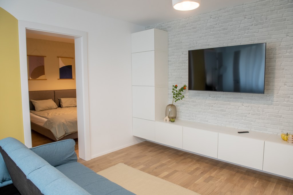 Spații de depozitare eficiente, linii minimaliste și accente de culoare care dau viață interiorului. Așa arată un apartament cu două camere din Capitală, după opt luni de renovări. Șantierul a pornit de la zero, pentru că din vechea locuință nu a rămas absolut nimic. Instalația electrică și cea sanitară au fost refăcute, parchetul a fost înlocuit, la fel și tâmplăria. Adina Avramescu de la Sundazed Interiors este designerul care s-a ocupat de amenajarea apartamentului.