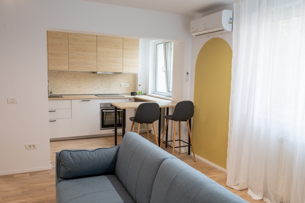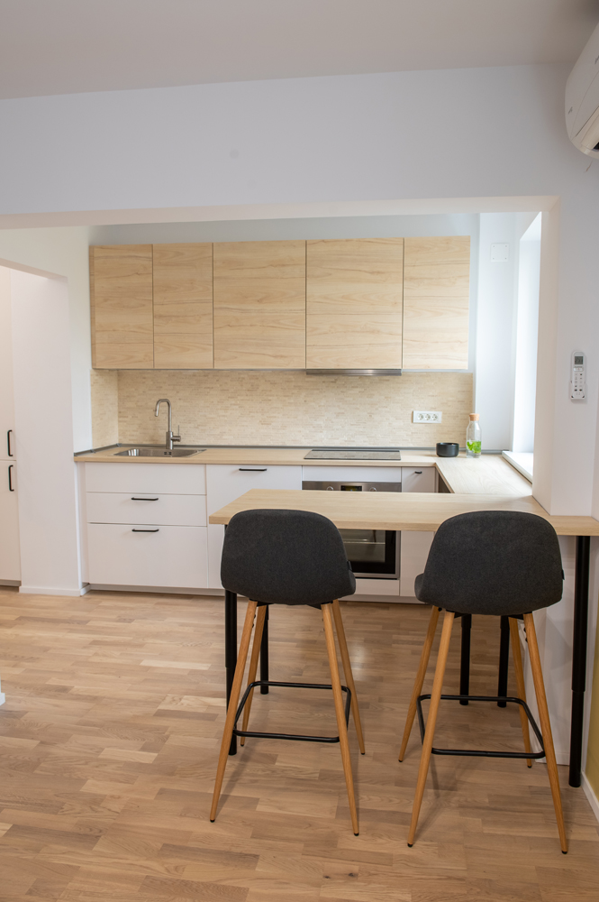 Livingul și bucătăria, despărțite printr-o insulă tip bar