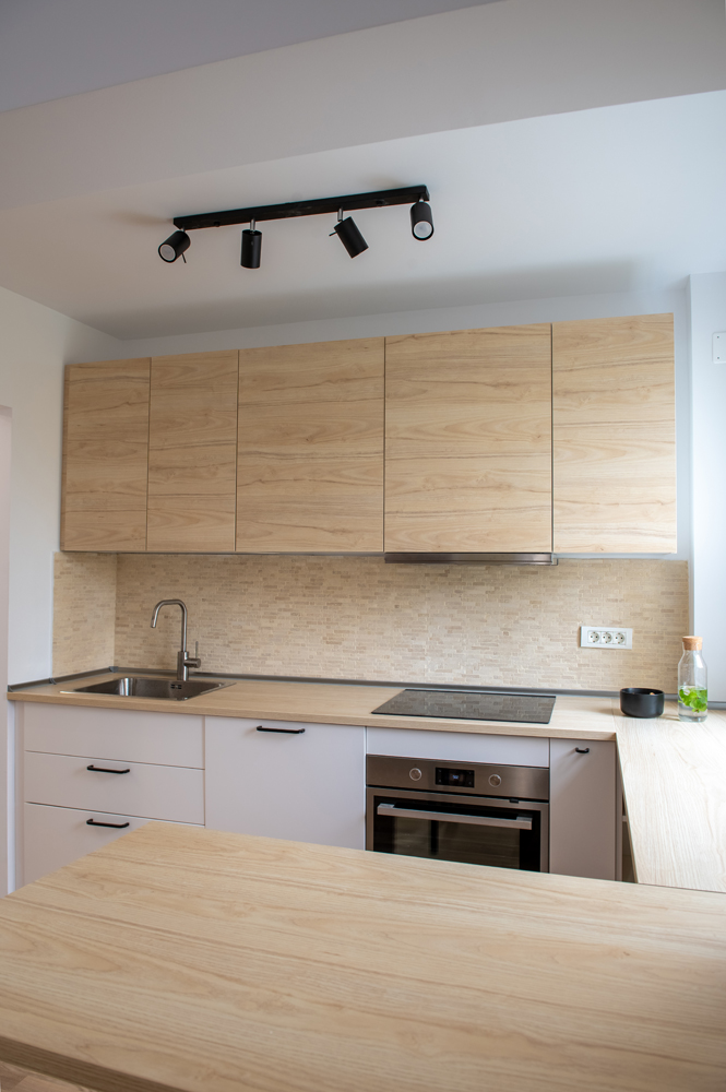 Pentru backsplash, Adina a folosit un mozaic de piatră care se potrivește cu cromatica mobilierului. Corpurile superioare au mânere ascunse pentru un look modern, în timp ce în partea de jos, mânerele negre funcționează ca elemente de contrast. Holul este folosit, în special pentru depozitare.