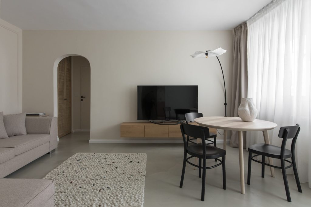 Apartamentul are trei camere, 80 de metri pătrați și se află într-un bloc vechi din cartierul bucureștean Vitan. Proprietarul l-a renovat prima dată în anii ’90, după moda de atunci, cu multe arcade de gips carton, scafe cu spoturi, gresie cu model și materialele în tendințe la momentul respectiv. Dar în 2019, niciun element din anii ’90 nu mai avea de-a face cu stilul de viață și gusturile lui, așa că a hotărât că e momentul pentru o schimbare, Pentru renovarea de față a lucrat cu arhitecții Alexandru Bucur și Răzvan Dumitriu de la biroul Interiology.