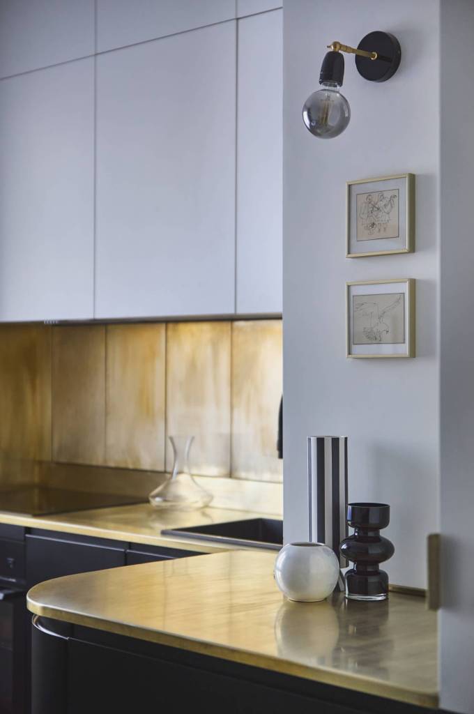 De la un spațiu aglomerat și întunecos, bucătăria a devenit un spațiu aerisit și elegant. Blatul de bucătărie este 100% din alamă, realizat la comandă, și reprezintă o inserție prețioasă. „Proprietarii se referă la locuința lor ca la cutia cu bijuterii, iar acest element s-a potrivit acestei descrieri”, explică Andra Bica, designerul care s-a ocupat de proiectul de amenajare.