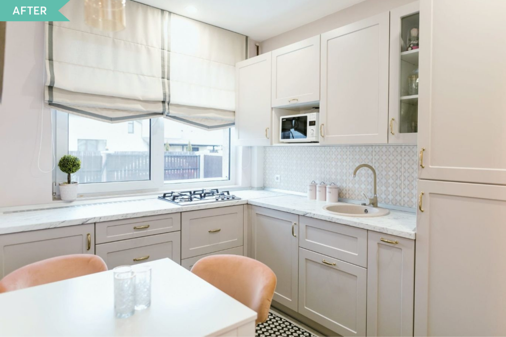 Bucătăria urmărește un design scandinav, modern și liniar, bazându-se pe o cromatică deschisă, la fel ca restul casei. Ea comunică direct cu restul zonelor de la parter, între ele și bucătărie fiind doar un perete despărțitor. Corpurile mobilierului au fost gândite astfel încât să formeze litera L, cu fronturi din MDF în nuanțe deschise, ca de cașmir, alături de un blat marmorat. Andreea a propus folosirea unor mânere aurii tocmai pentru a aduce puțin din stilul efectul glam folosit și în zona de dining a casei.