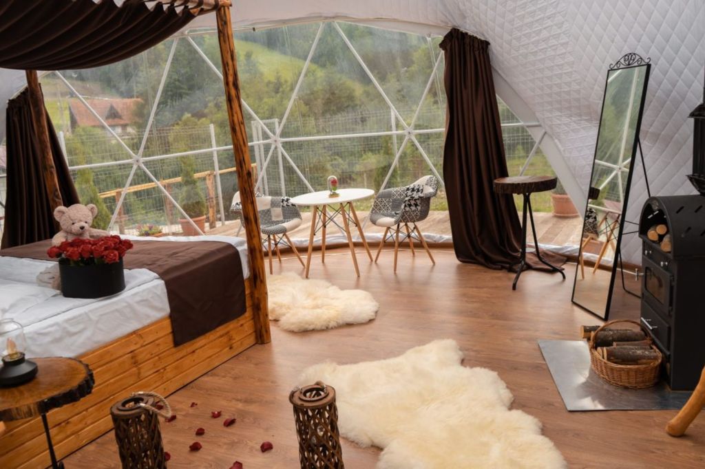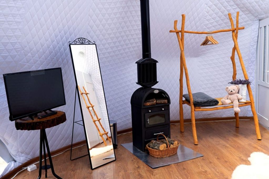 Facilitățile din acest glamping de pe Valea Prahovei, unul dintre cele mai luxoase din țară, justifică prețul destul de ridicat al unei nopți într-un astfel de igloo.