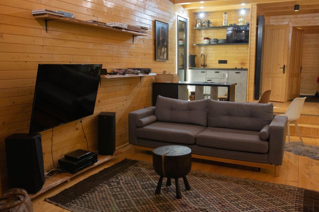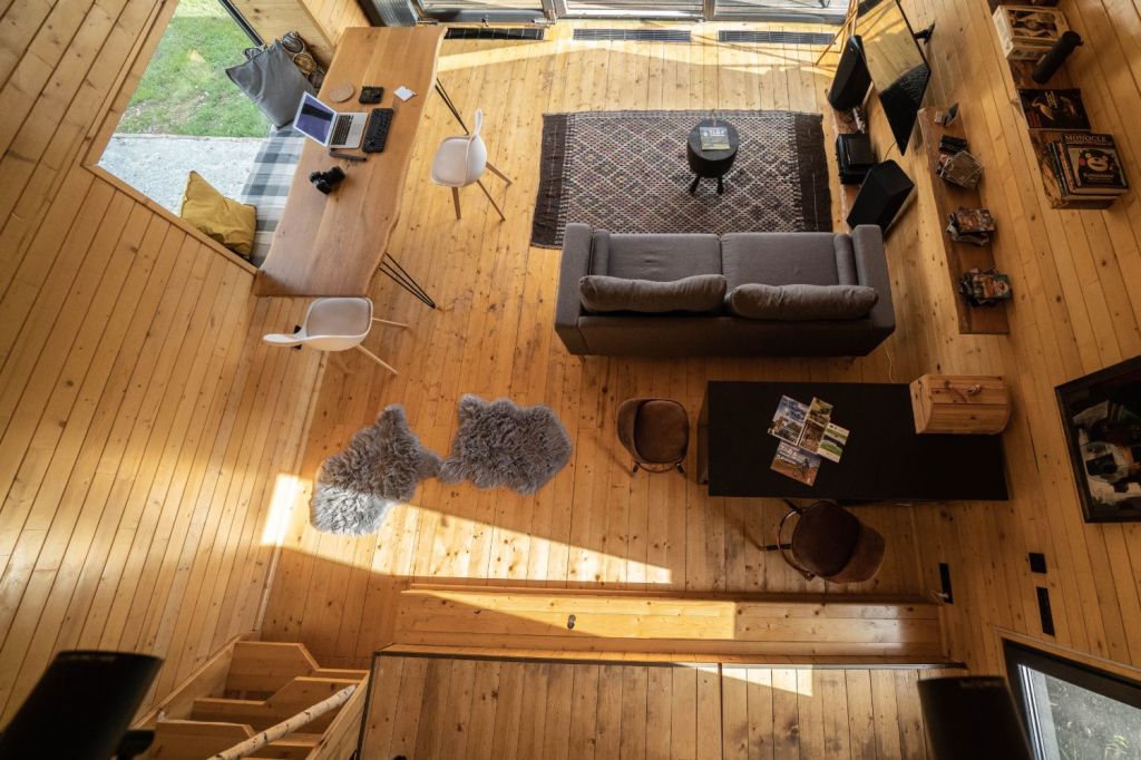 Au urmat șase luni de muncă intensă, iar în decembrie 2020, cabana a fost inaugurată. Rezultatul i-a cucerit, deja, pe turiștii care-și doresc un loc cool pentru vacanța lor: o casă în stil nordic, cu ferestre până-n podea, design minimalist pe bază de lemn, saună, ciubăr cu apă caldă și, cel mai important, pădurea-n față.