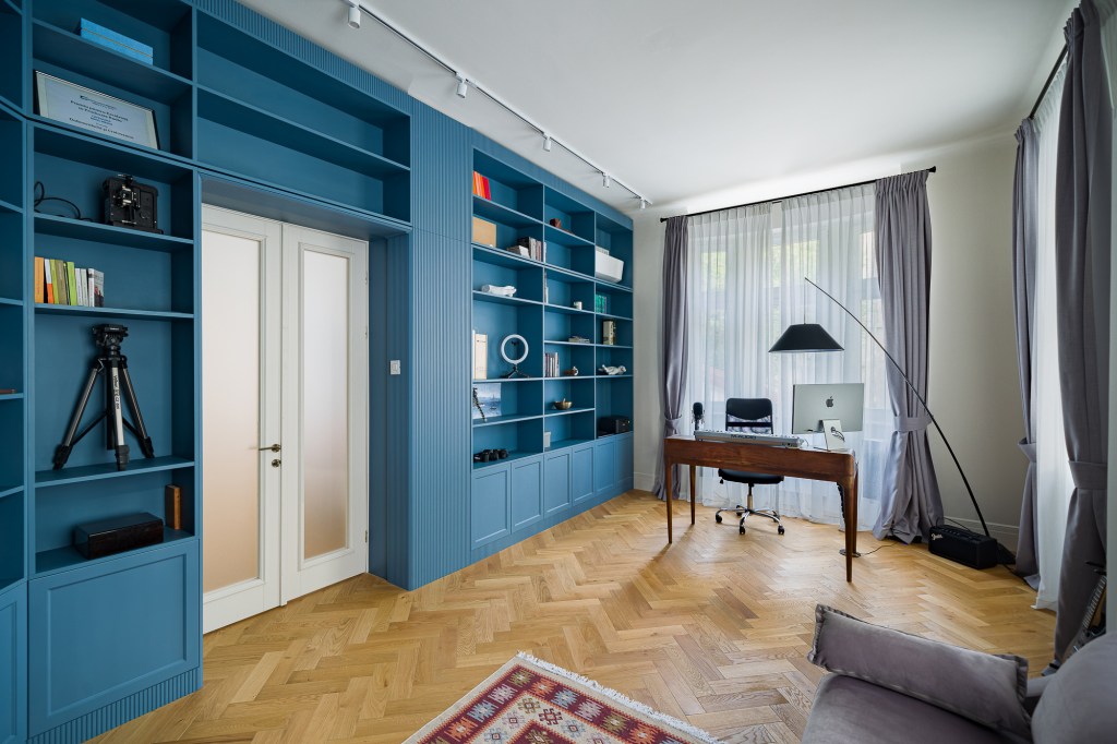 O întreagă încăpere doar pentru bibliotecă și birou