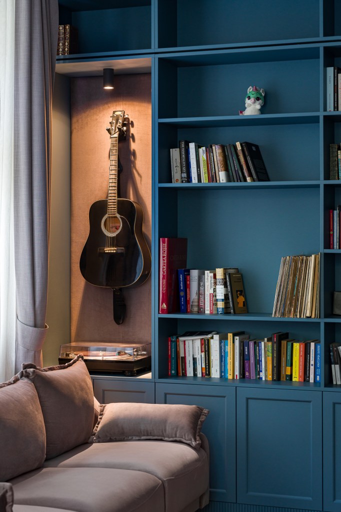O încăpere spectaculoasă este biblioteca, un spațiu multifuncțional, folosit ca birou, spațiu de relaxare, hobby și la nevoie, cameră de oaspeți. Mobilierul este custom made și îmbracă tot spațiul. Există loc și pentru o scară care se plimbă de jur împrejur pentru a avea acces pe toată înălțimea peretelui.