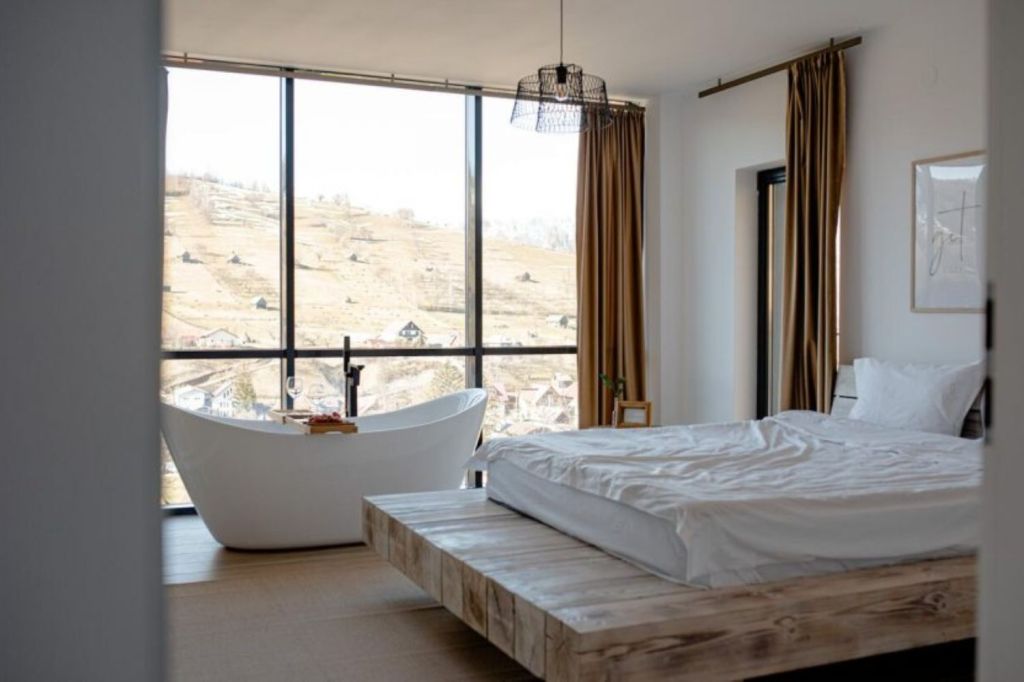 Localizată în satul Șimon din comuna Bran, On Top Chalet are priveliște panoramică asupra peisajului montan, ferestre din tavan până în podea și câte o minunată cadă în dormitor, pentru răsfățul total al simțurilor. E pe un deal, la distanță de drumul principal și de restul caselor, fără să fie nici prea ruptă de lume: găsești restaurante bune și magazine în imediata apropiere.