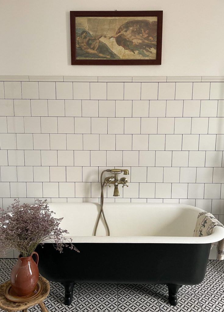 Finisajele folosite în amenajarea casei continuă tematica old world. Alexandra spune că, pentru baie, a căutat destul de mult un model de faianță care să se potrivească stilului ales. A căutat, în primul rând, în magazinele de bricolaj și materiale de construcții, gândindu-se că acolo prețurile sunt ceva mai accesibile. Într-adevăr, în Brico Depot a găsit o faianță albă, simplă care i-a plăcut. A pus-o în valoare, folosind chit de culoare închisă și a completat look-ul cu obiecte sanitare vintage. Baia este cu adevărat un spațiu de revistă, prin piesele de mobilier alese. Foarte mult contează însă și lumina naturală de care se bucură încăperea. Până acum, casa a costat 130.000 euro, cu tot cu teren. Dar trebuie spus că lucrările sunt făcute, în mare măsură, în regie proprie.