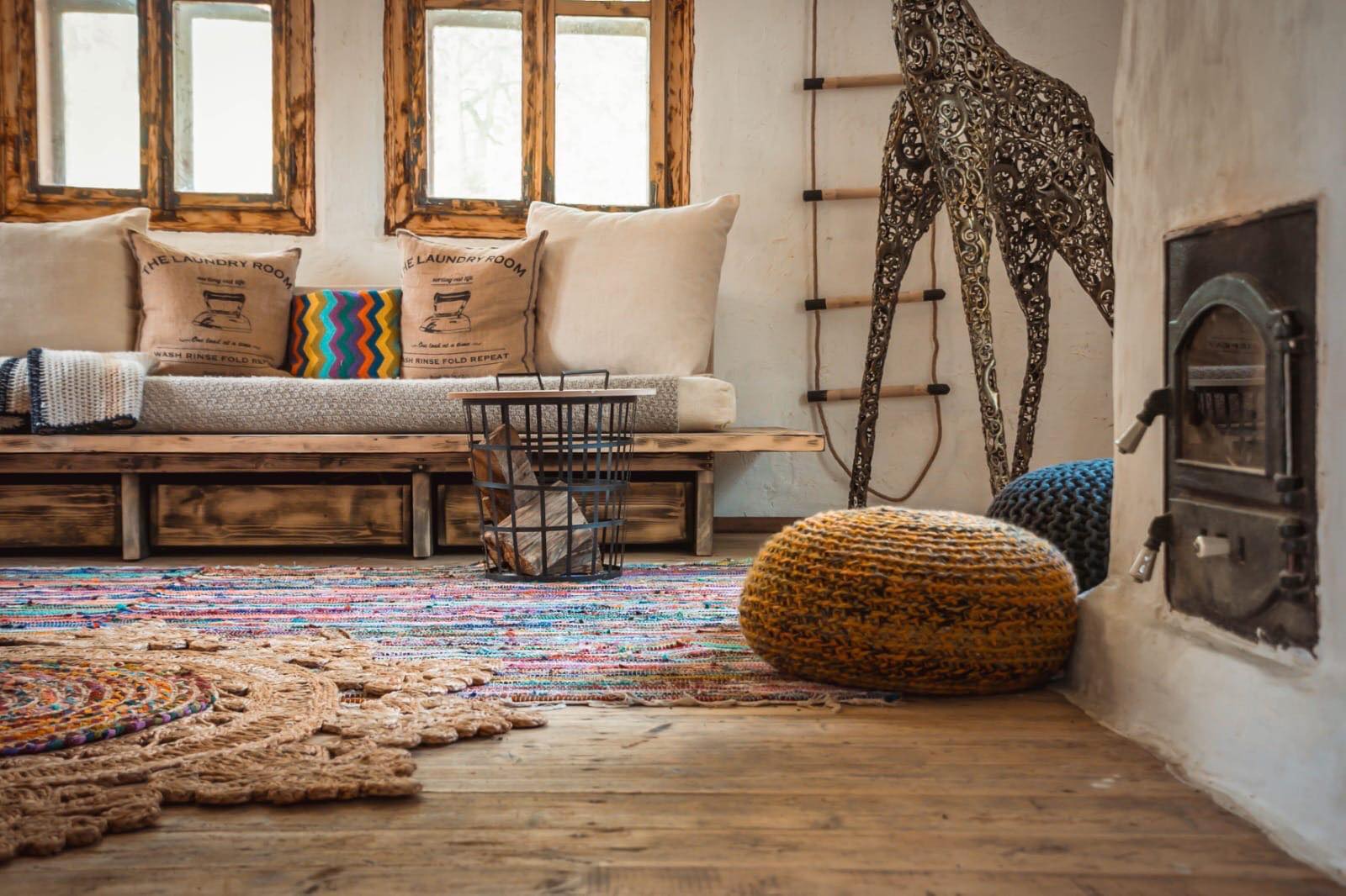 Consolidarea casei a durat tot atât cât vara lui 2018, iar interiorul este de atunci într-o continuă schimbare. Girafa din metal, luată dintr-un târg de vechituri dinainte de a cumpăra casa, completează perfect livingul dechis pe două niveluri.