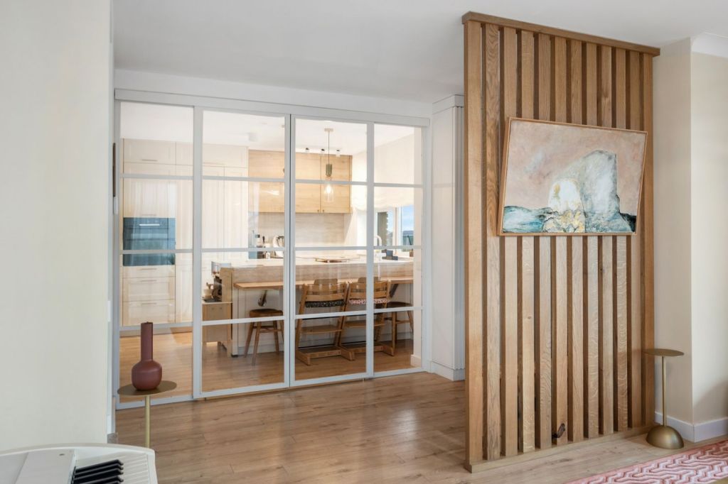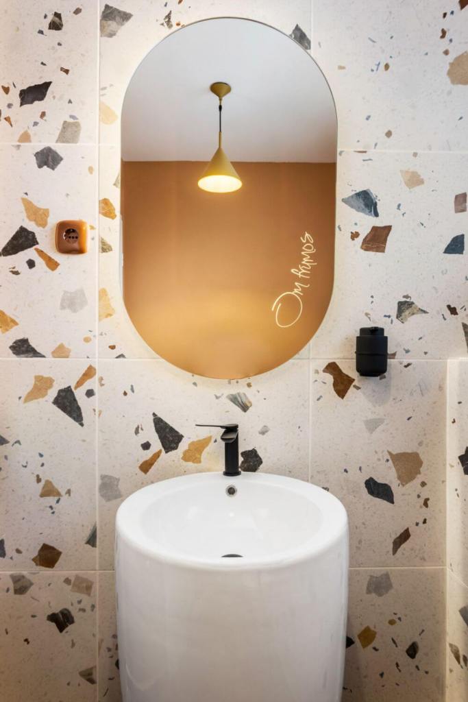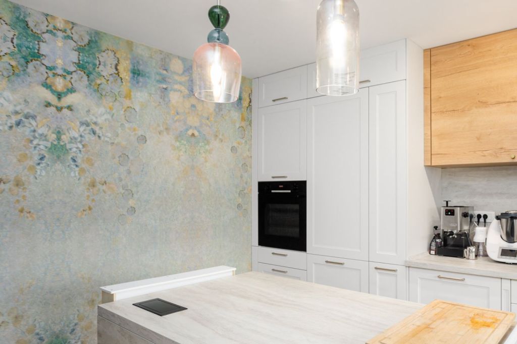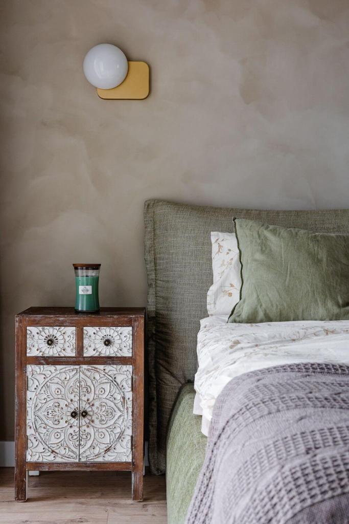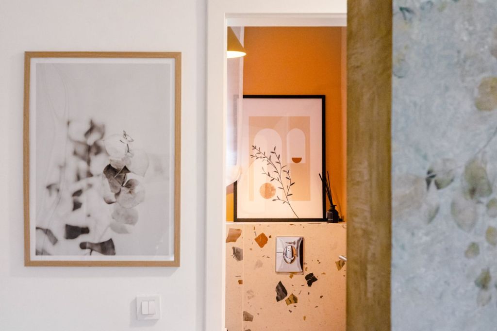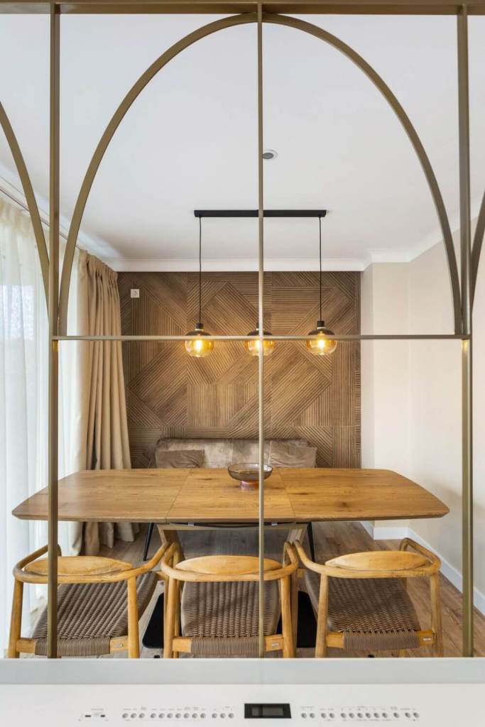 A introdus câteva elemente cheie, care să încălzească spațiul cât mai mult. De exemplu, a încadrat fereastra din living cu lemn masiv, a montat polițe și un divider din metal auriu desenat și personalizat după modelele de arcade adorate de către proprietari și, nu în ultimul rând, tapetul cu textură canvas mixat fie cu glet decorativ 3D, așa cum este în bucătărie, fie cu vopsea decorativă cu efect organic, așa cum este în matrimonial.