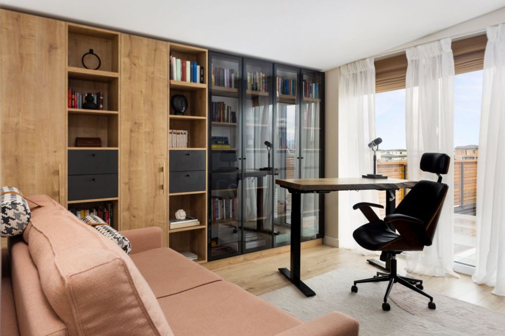 Cât despre birou, totul a început de la piesa must a clienților – pick-up-ul cu multe vinyluri. Atmosfera din această încăpere este ușor artistică și muzicală, tapetul retro black & white de la Vladila întregind și mai mult conceptul. Ambientul inspirațional este extrem de bine completat de biblioteca plină de cărți, dar și de un birou comod, reglabil pe înălțime, pentru a fi folosit și pentru vlogging.