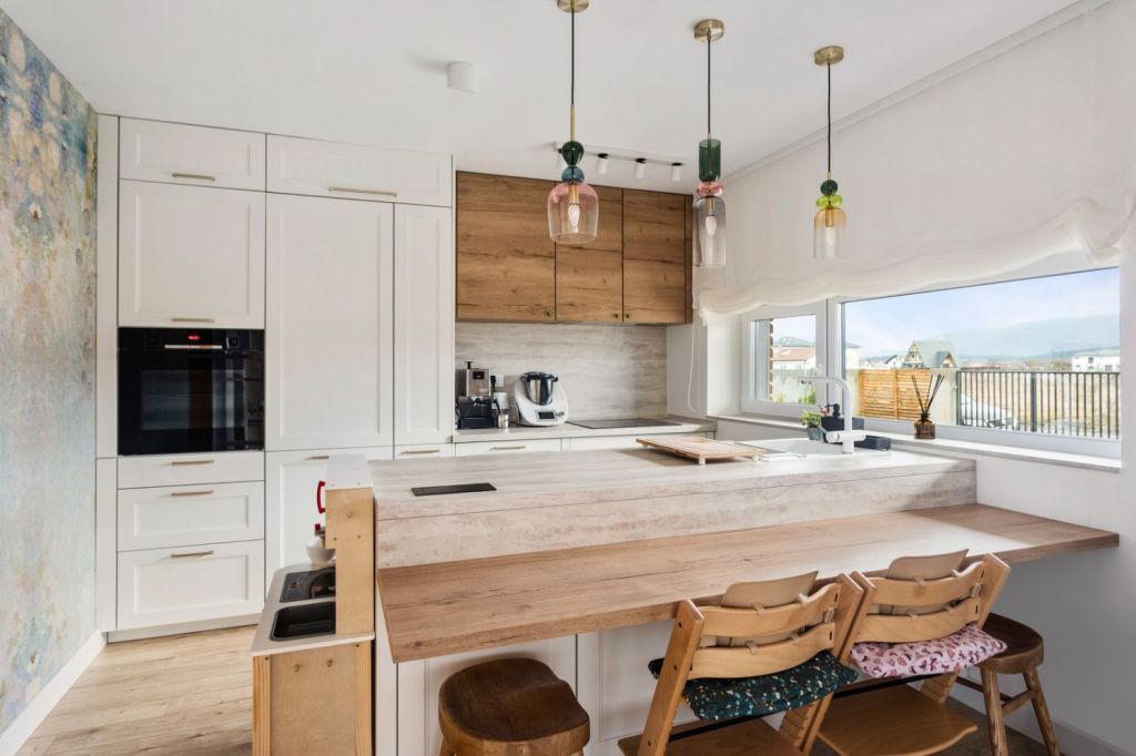 Când vine vorba despre obiecte mult dorite, proprietarii au ținut foarte mult la ușile albe din bucătărie, din metal și sticlă. De asemenea, un alt obiect dorit, ușor mai costisitor, a fost biroul: blatul realizat din lemn masiv de 4,5 centimetri și picioarele metalice, reglabile pe înălțime.