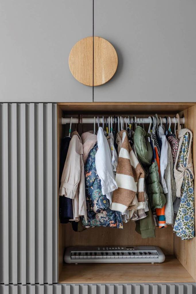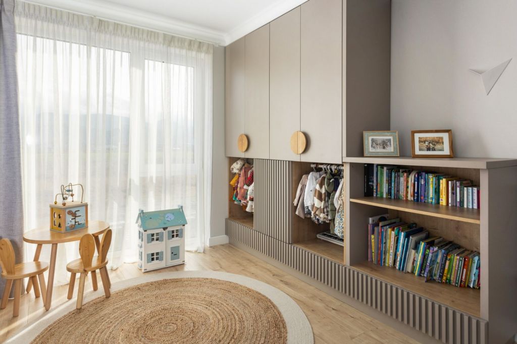 „Fiecare copil are compartimentul său de hăinuțe și ambele zone sunt amplasate jos, pentru înălțimea lor. Același principiu a fost aplicat si pentru polițele deschise pentru cărți. În rest, toate spațiile au fost în mod voit gândite cu fronturi închise, inclusiv căsuța “Amsterdam” cu fronturi superbe, plină de jucării”, povestește Laura.