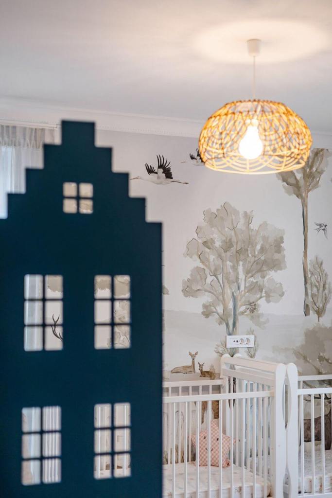 Pădurea din apropierea casei a fost inspirație pentru dormitorul celor mici. Tapetul feeric împreună cu căsuța bleumarin de la MAMA și Lemnul, reprezintă piesele principale din amenajare.