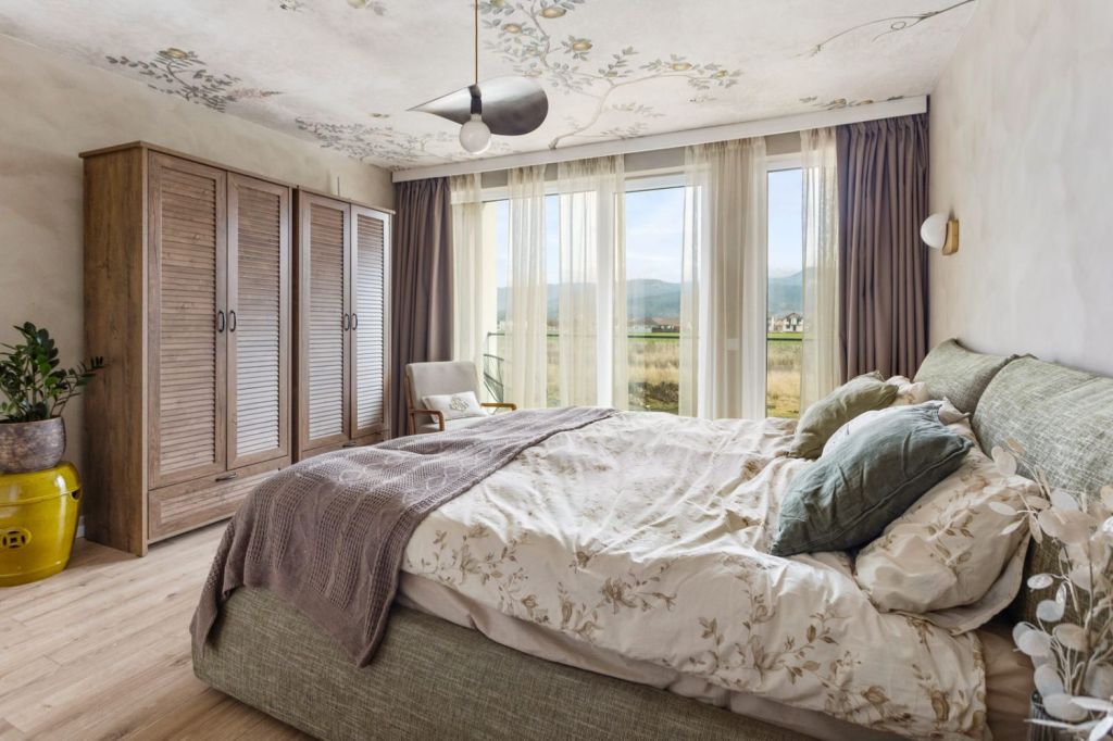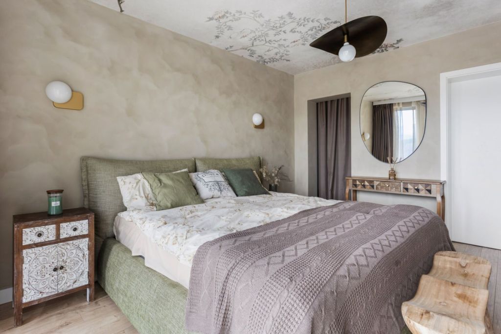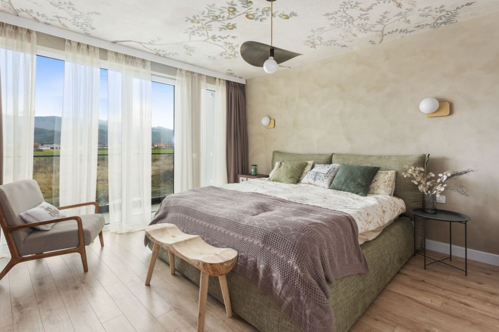 Etajul cuprinde dormitorul matrimonial, dormitorul gemenilor, dar și o cameră tip birou. „Matrimonialul este o poezie, trebuie doar privit”, spune Laura. Întregul concept a pornit de la vopseaua decorativă tip stucco mat de la Ton Corner de pe pereți și a continuat cu tapetul delicat de pe tavan care continuă și în dressing. Pentru a obține un efect de continuitate vizuală, au ales sa desființeze ușa dintre dormitor și dressing și să monteze o draperie opacă din catifea care se continuă și pe ferestre.