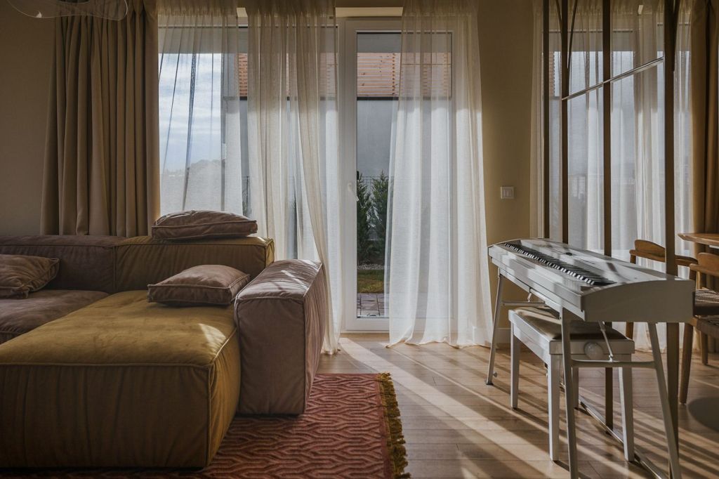 - Observă lumina din fiecare încăpere și ține cont de culorile folosite. Nu te sfii să alegi nuanțe calde și bogate în texturile mobilierului ales. Eu am folosit catifea muștar, accente energice de coniac și vâscoză satinată cărămizie. Astfel am potențat jocul razelor de soare care creează un spectacol. Evită să folosești vopsea albă sau mobilă albă în spații cu soare direct. Prea multă reflecție și strălucire artificială poate deveni obositoare.