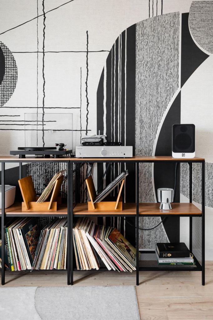 - Dacă există un obiect de la care pornești amenajarea, spre exemplu un pick-up, primul pas poate fi alegerea unui finisaj pentru pereți, astfel încât să îl susțină conceptual și cromatic, de exemplu un tapet alb negru artistic. Ulterior, completează camera cu piese utile, alese într-o estetică neutră. Animă folosind accesorii mai speciale, precum niște tușe glossy: sticlă fumurie, un covor de lână, o pernuță statement sau un lampadar elegant;
