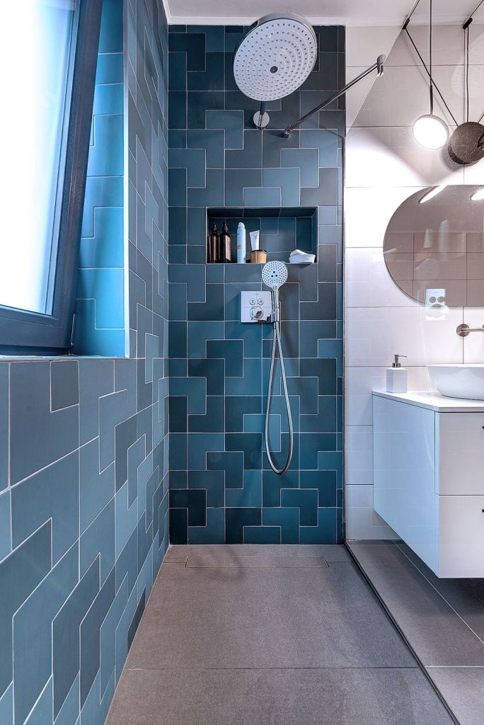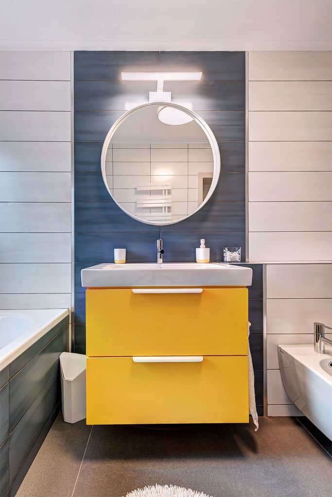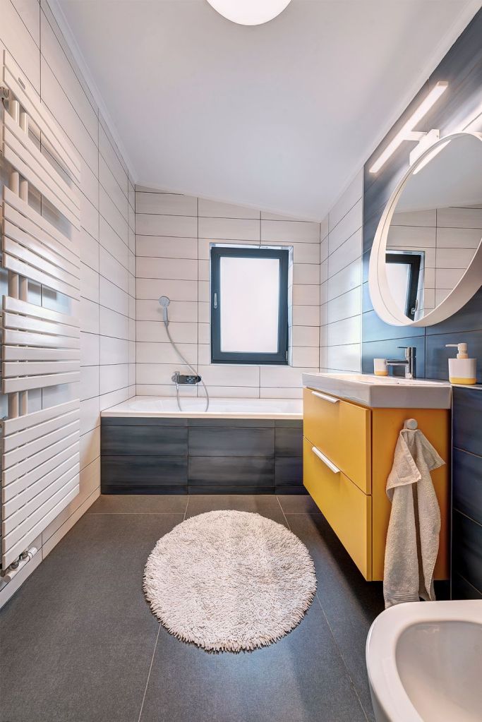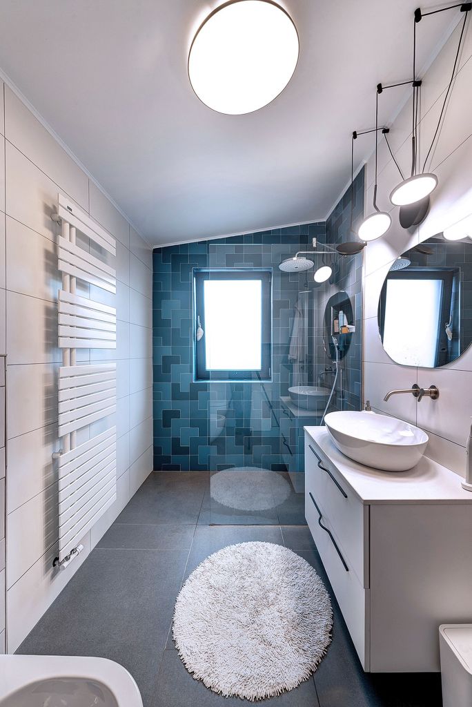 La etaj, una dintre cele două băi are cadă, finisaje neutre și un accent galben, pe care designerii l-au inserat prin mobilier. În cealaltă baie au amenajat o zonă de duș walk-in „îmbrăcată” în ceramică albastră, pe care au folosit-o drept contrast pentru celelalte finisaje ceramice, albe și gri.