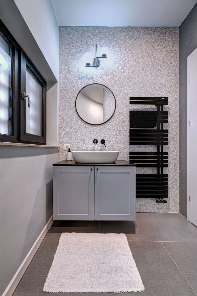 Toate cele trei băi au atmosfere diferite, create prin finisaje, prin culori și prin designul elementelor. Baia de la parter, care este folosită și pentru camera de oaspeți, a fost amenajată cu duș walk-in integrat într-un perete curbat.
